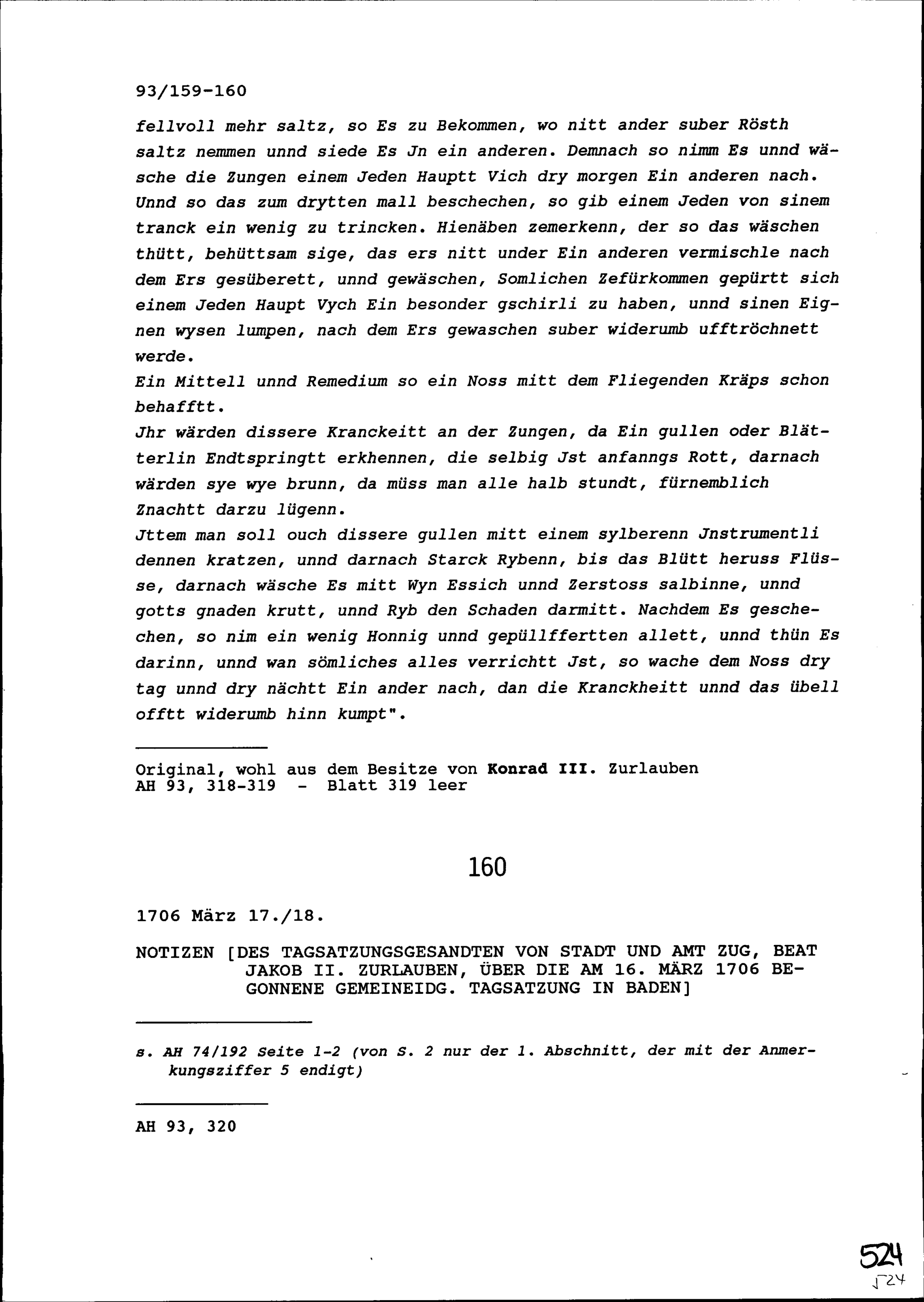 Notiz von Beat Jakob II. Zurlauben, Tagsatzungsgesandter von Stadt und Amt Zug, über die am 16. März 1706 begonnene Tagsatzung in Baden