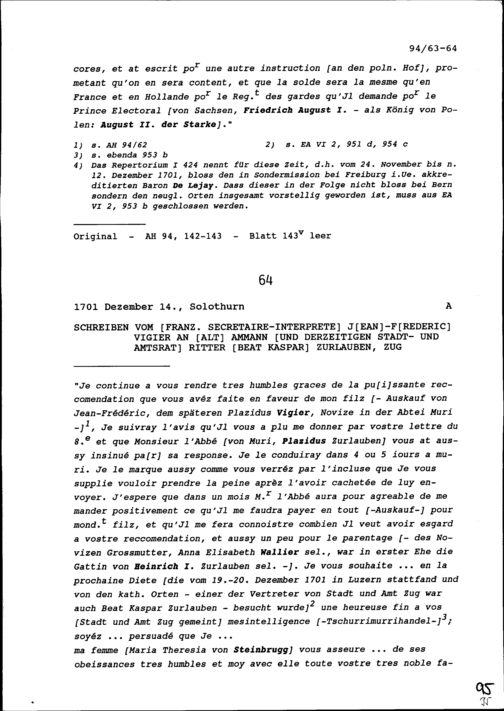 Schreiben von Jean-Frédéric Vigier, französischer Dolmetscher, an Beat Kaspar Zurlauben,...