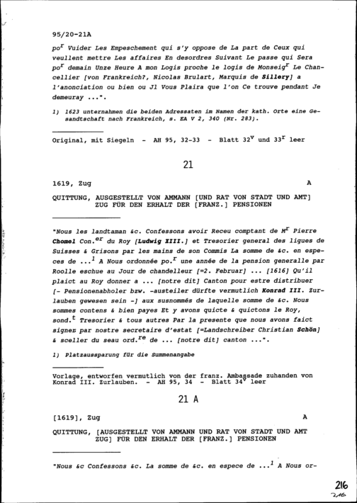 Quittung für den Erhalt der französischen Pensionen, ausgestellt von Ammann und Rat von Stadt und Amt Zug
