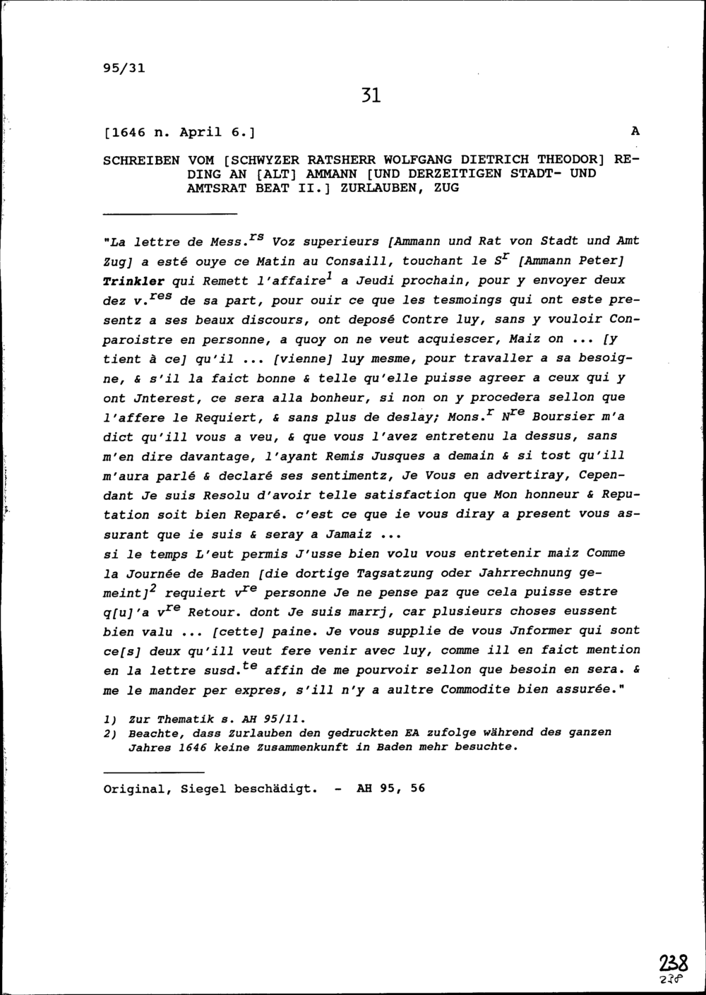 Schreiben von Wolfgang Dietrich Theodor Reding, Ratsherr Schwyz, an Beat II. Zurlauben, Altammann und Stadt- und Amtrat, Zug