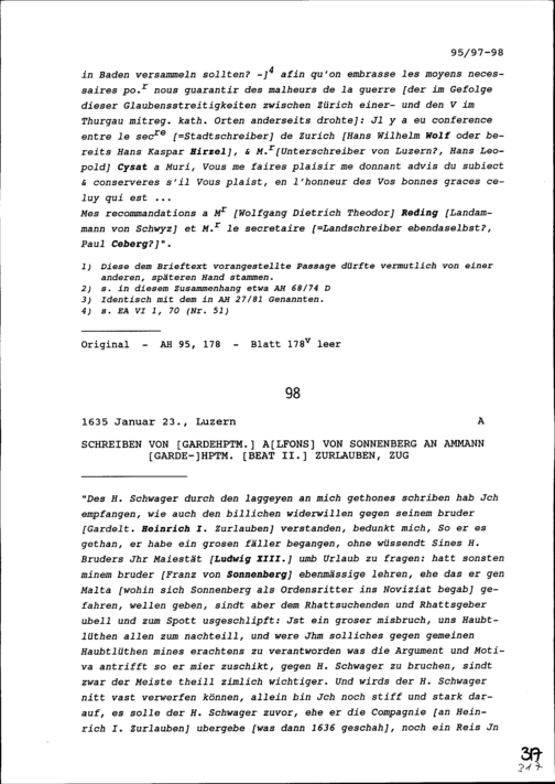 Schreiben von Alfons von Sonnenberg, Gardehauptmann, an Beat II. Zurlauben, Ammann und Gardehauptmann, Zug