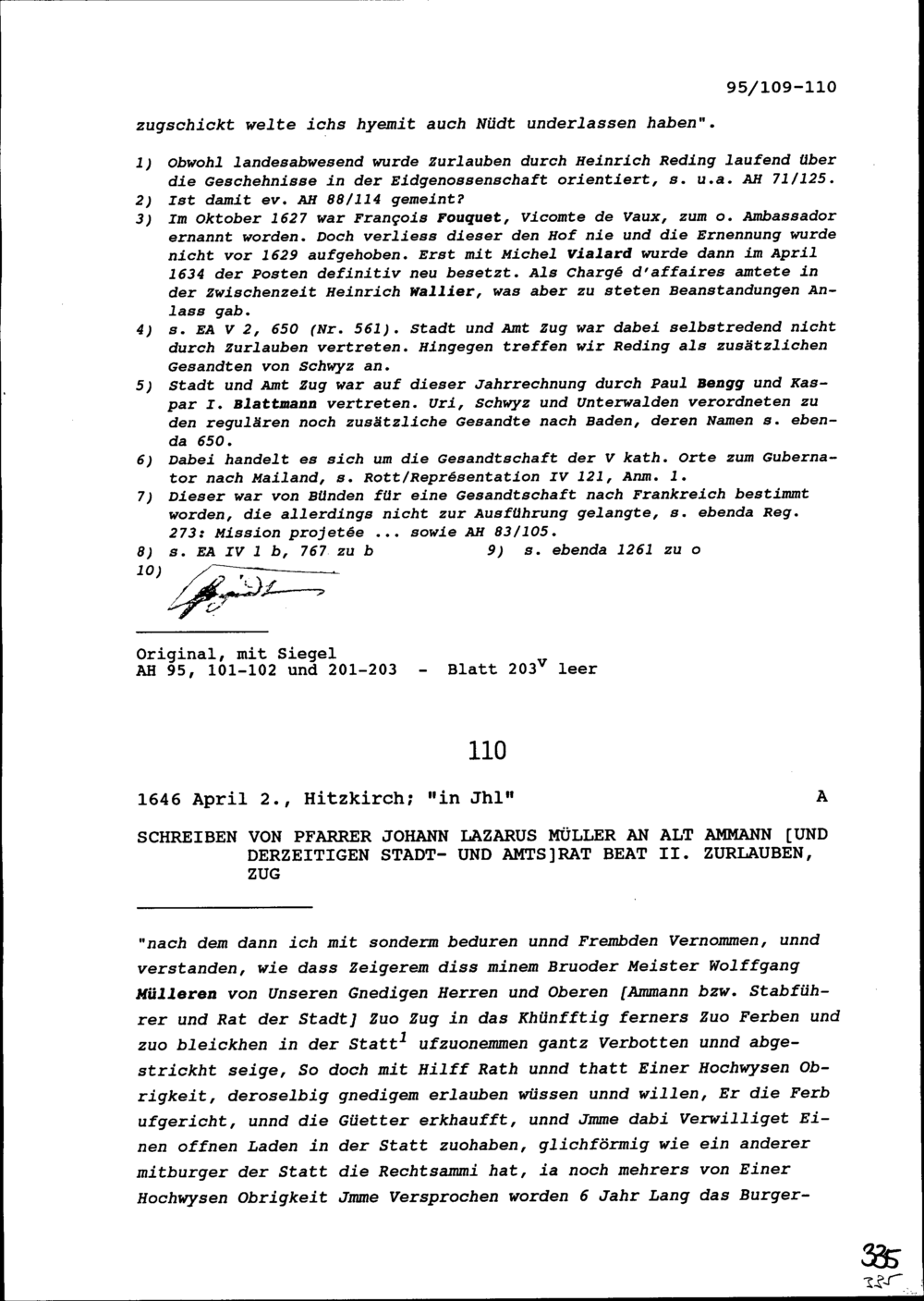 Schreiben von Johann Lazarus Müller, Pfarrer, an Beat II. Zurlauben, Altammann und...