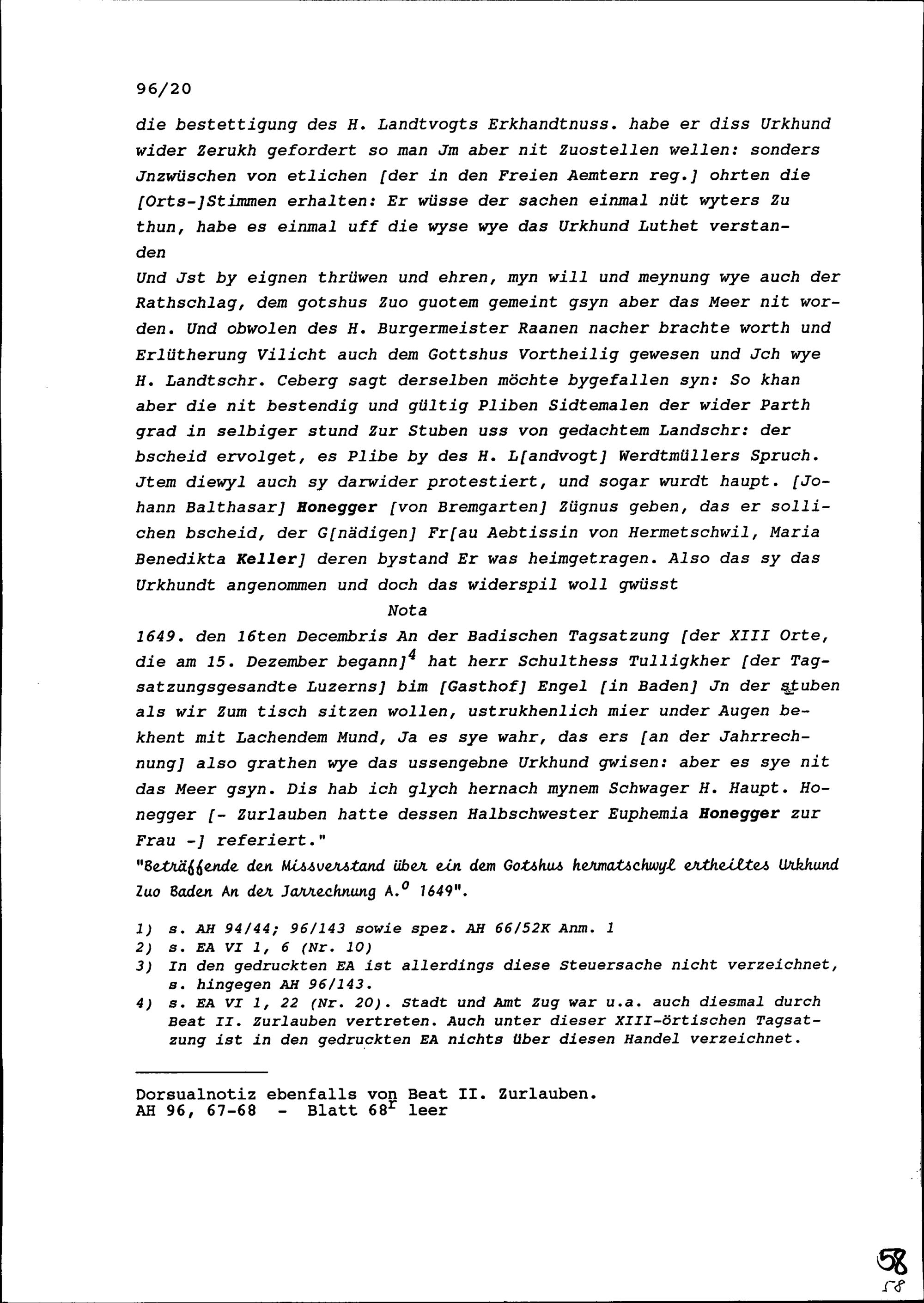 Bericht von Beat II. Zurlauben, Stadt- und Amtrat Zug, bezüglich der umstrittenen Steuerpflichten des Klosters Hermetschwil gegenüber den Freien Ämter