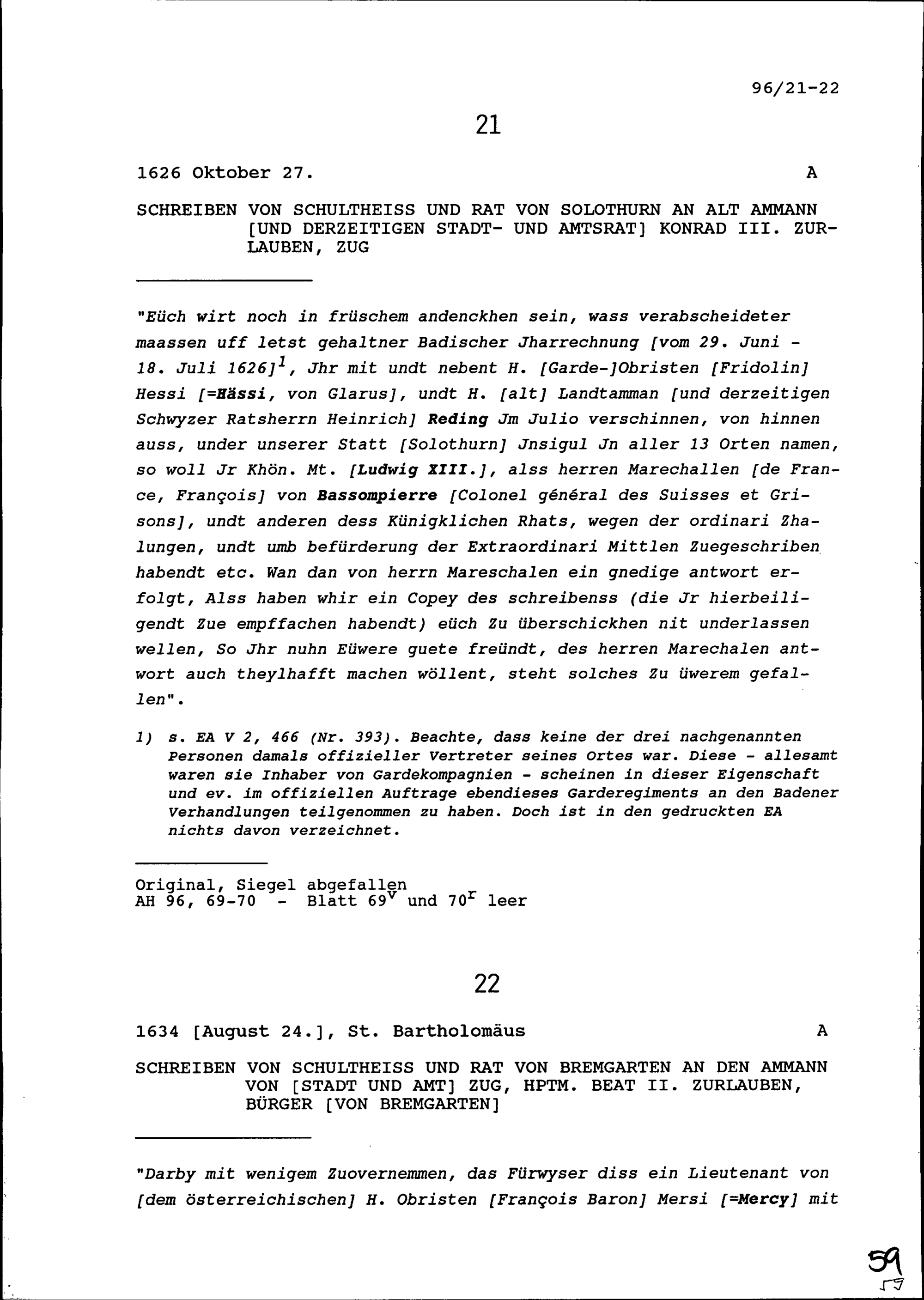 Schreiben des Schultheiss und Rats Solothurn an Konrad III. Zurlauben, Altammann...