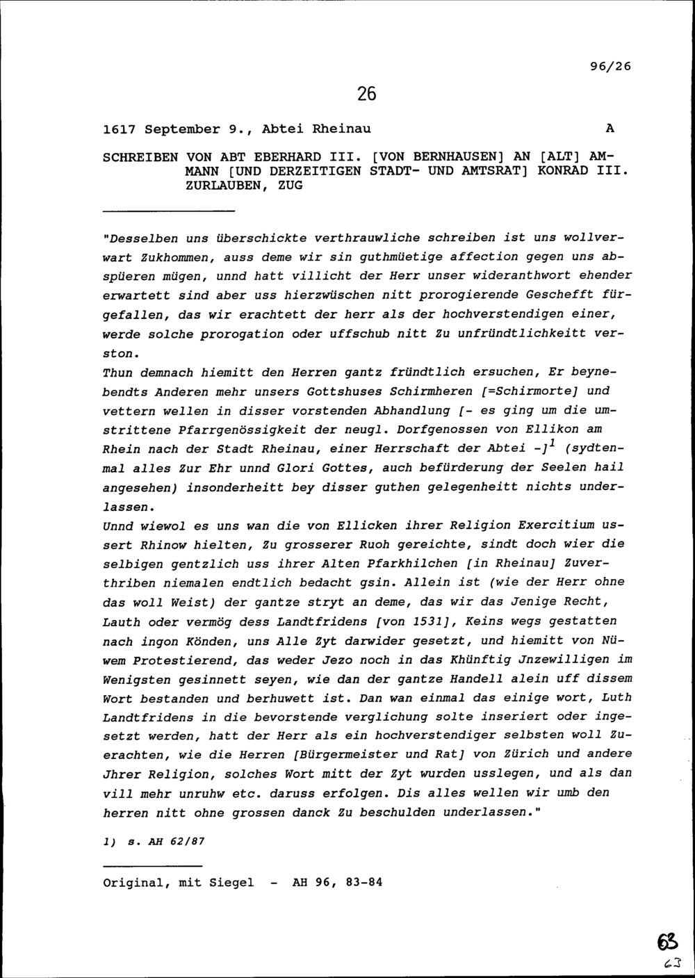 Schreiben von Eberhard III. von Bernhausen, Abt, an Konrad III. Zurlauben, Altammann...
