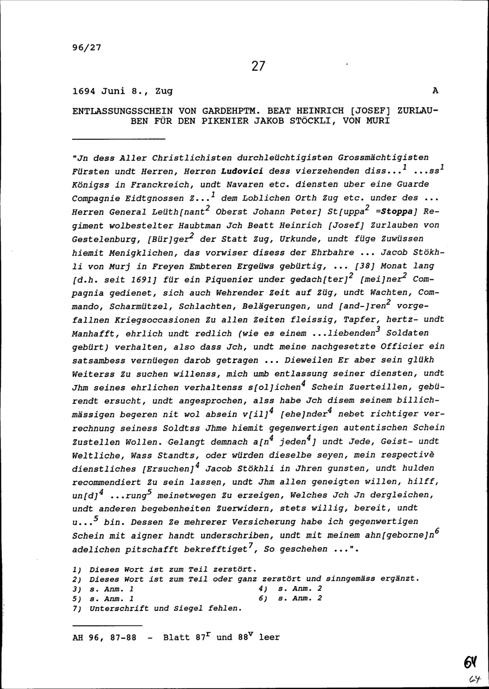 Entlassungsschein von Beat Heinrich Josef Zurlauben, Gardehauptmann, für Jakob Stöckli, Pikenier, von Muri