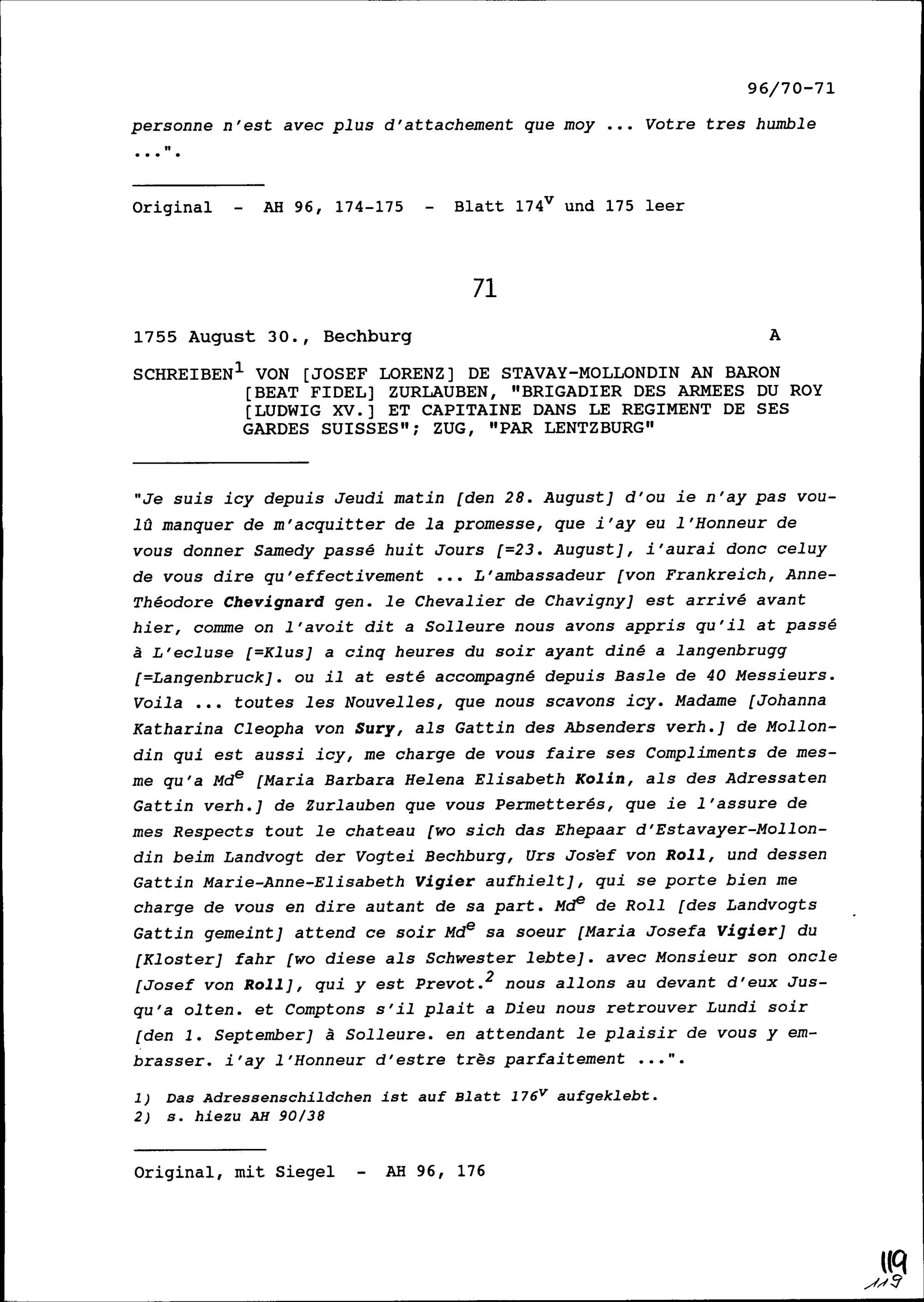 Schreiben von Josef Lorenz de Stavay-Mollondin an Beat Fidel Zurlauben, Brigadier, Zug