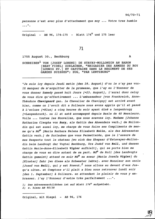 Schreiben von Josef Lorenz de Stavay-Mollondin an Beat Fidel Zurlauben, Brigadier,...