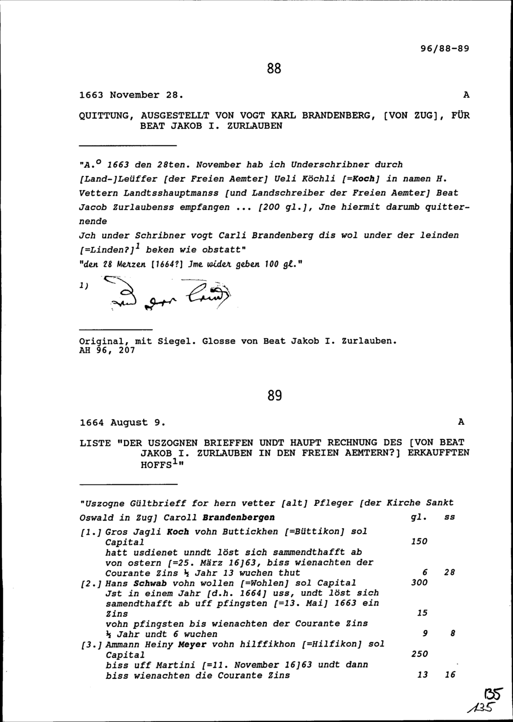 Quittung für Beat Jakob I. Zurlauben, ausgestellt von Karl Brandenberg, Vogt, Zug