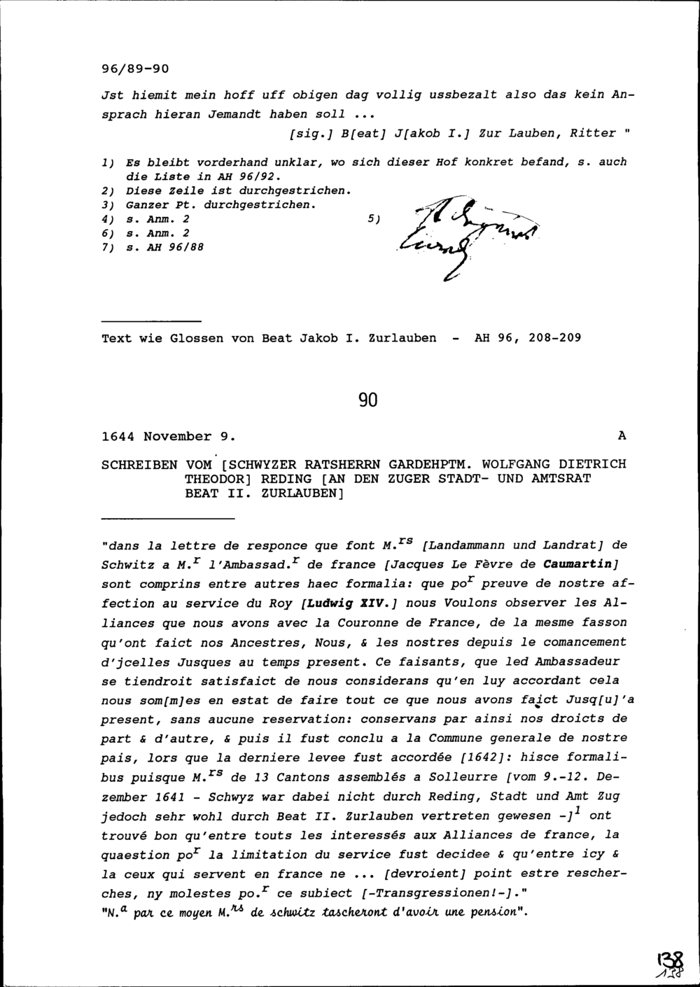 Schreiben von Wolfgang Dietrich Theodor Reding, Ratsherr Schwyz und Gardehauptmann, an Beat II. Zurlauben, Stadt- und Amtrat Zug