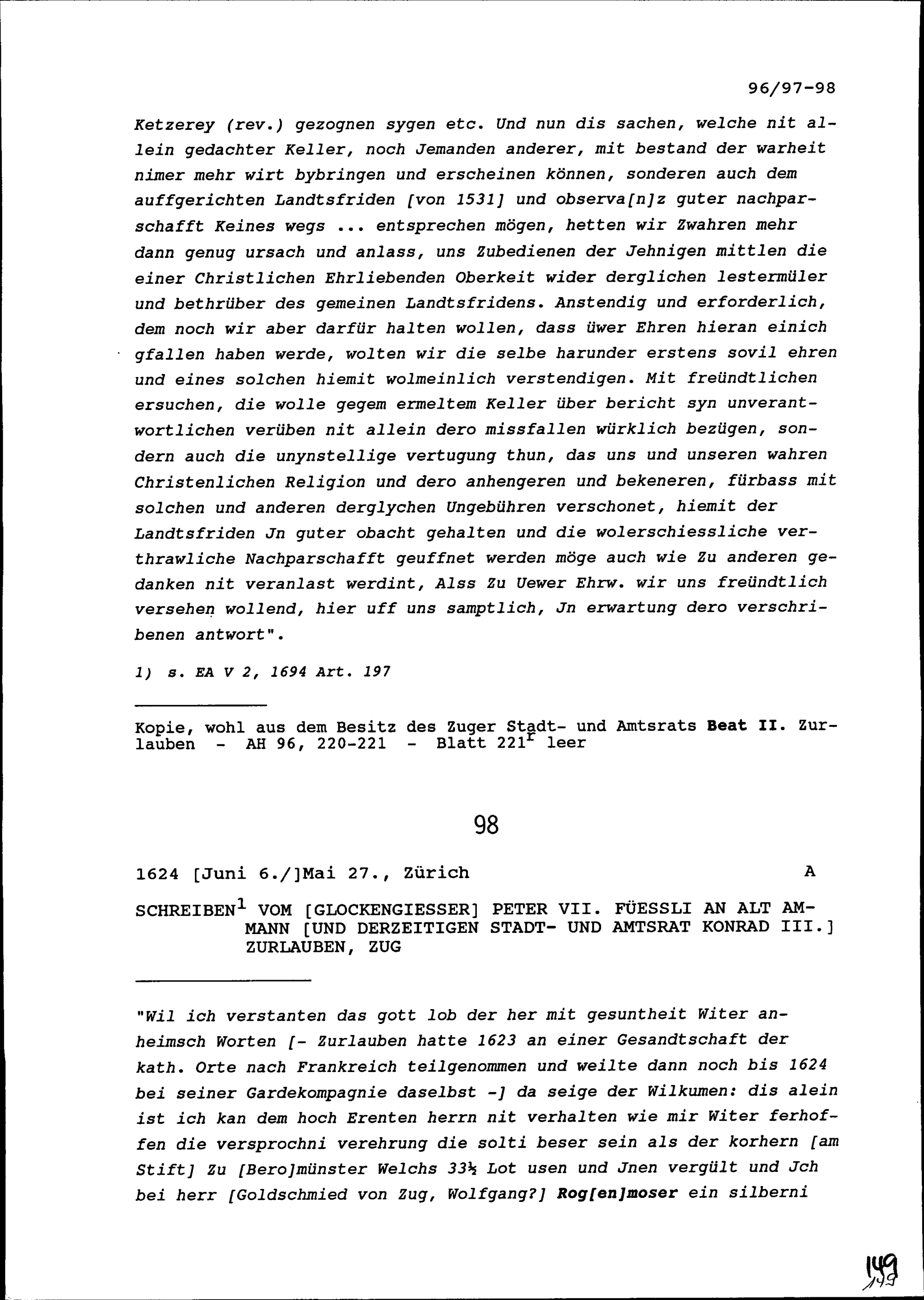 Schreiben von Peter VII. Füessli, Glockengiesser, an Konrad III. Zurlauben, Altammann und Stadt- und Amtrat, Zug