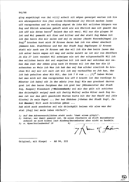 Schreiben von Peter VII. Füessli, Glockengiesser, an Konrad III. Zurlauben, Altammann und Stadt- und Amtrat, Zug
