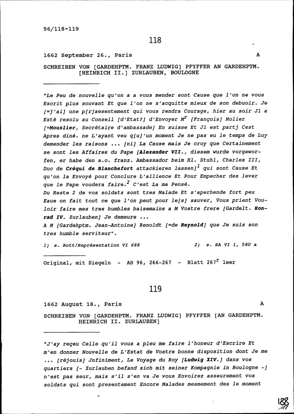 Schreiben von Franz Ludwig Pfyffer, Gardehauptmann, an Heinrich II. Zurlauben, Gardehauptmann, Boulogne