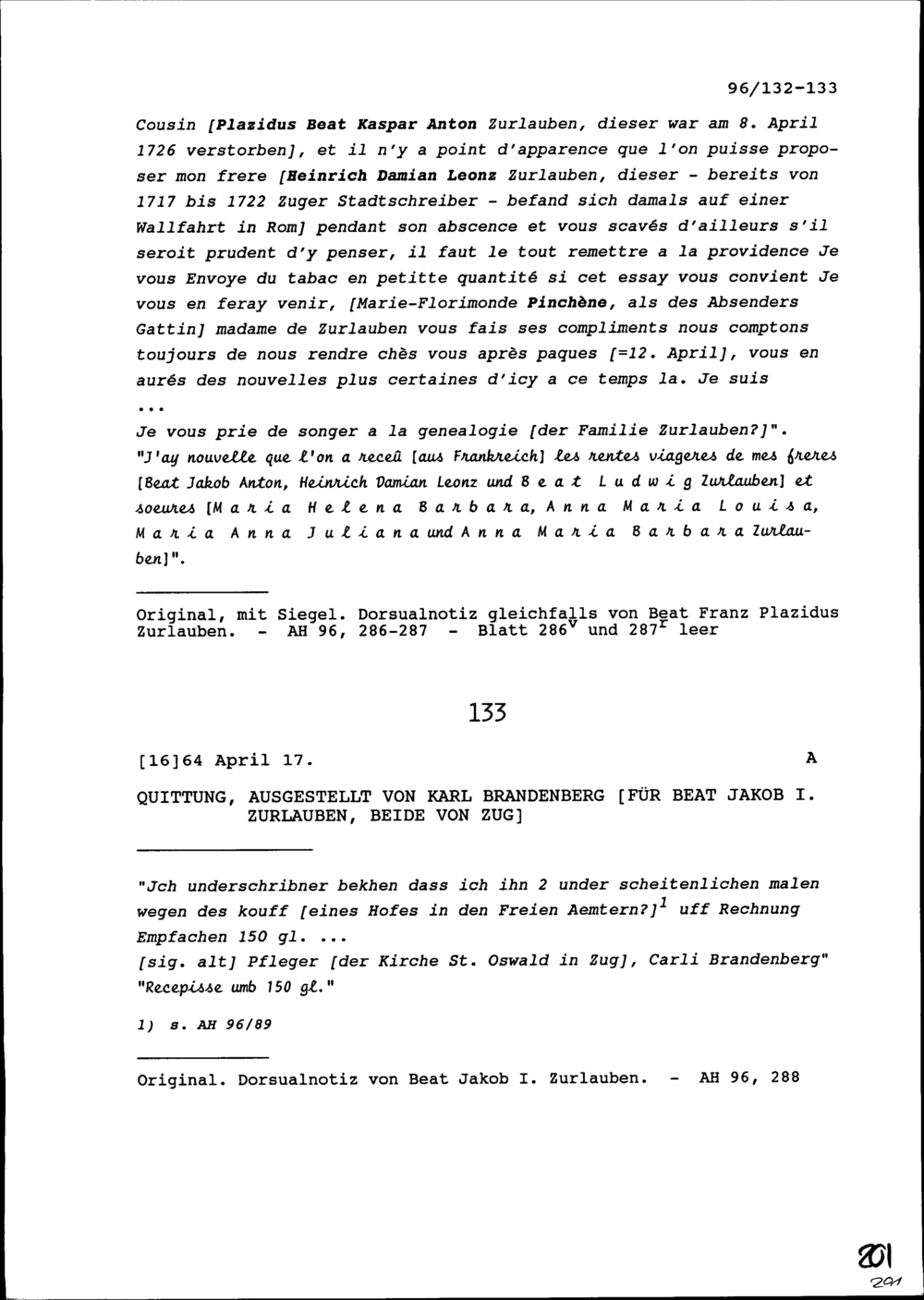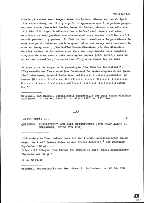 Quittung für Beat Jakob I. Zurlauben, von Zug, ausgestellt von Karl Brandenberg