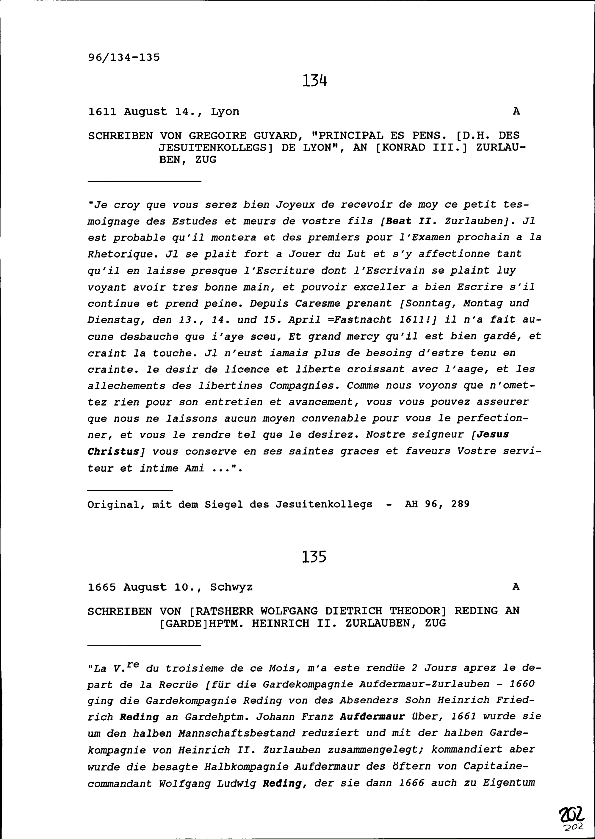 Schreiben von Gregoire Gyard, Leiter des Jesuitenkollegs in Lyon, an Konrad III. Zurlauben, Zug