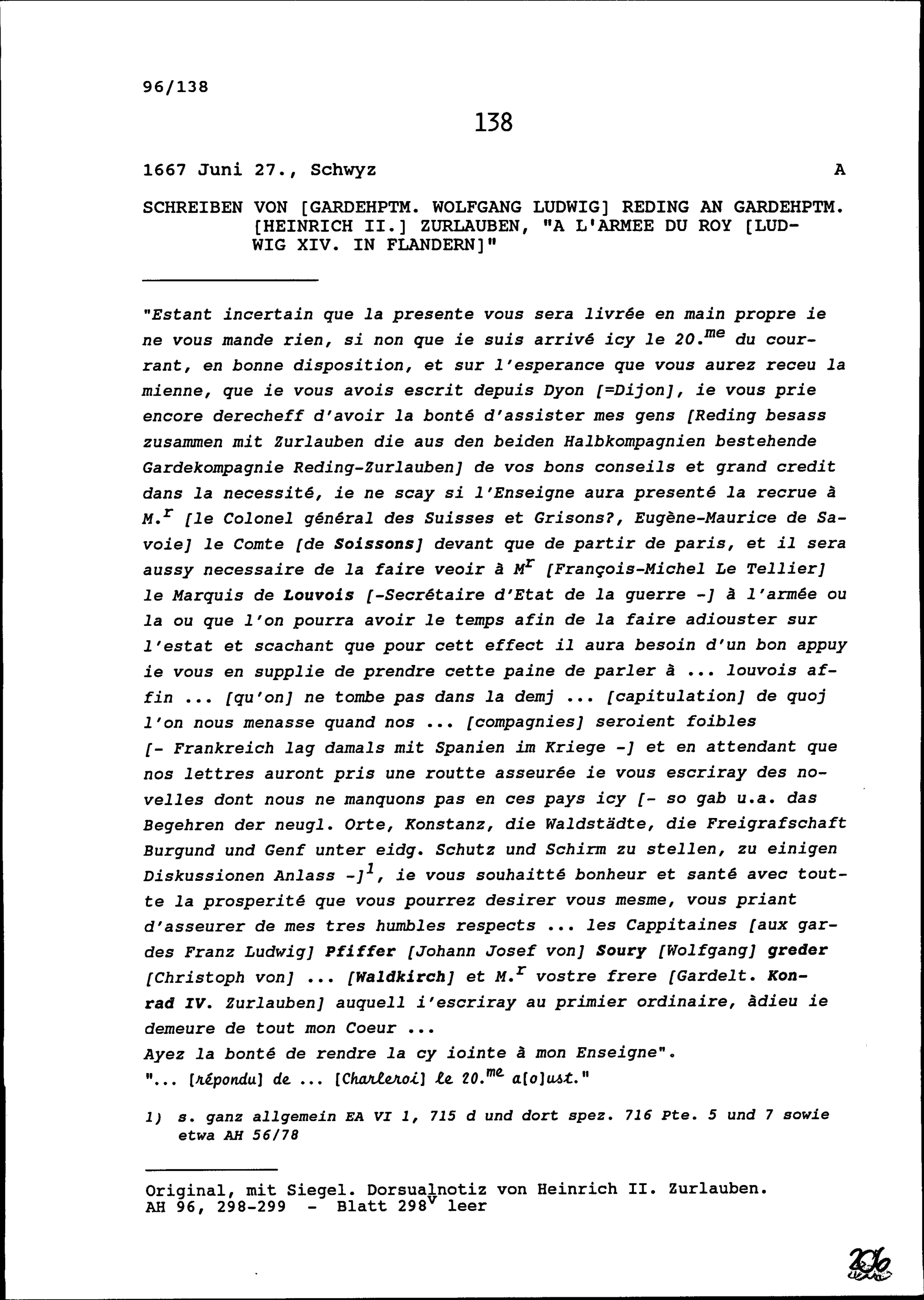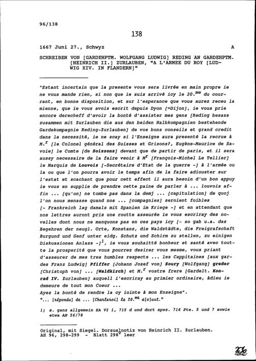 Schreiben von Wolfgang Ludwig Reding, Gardehauptmann, an Heinrich II. Zurlauben,...