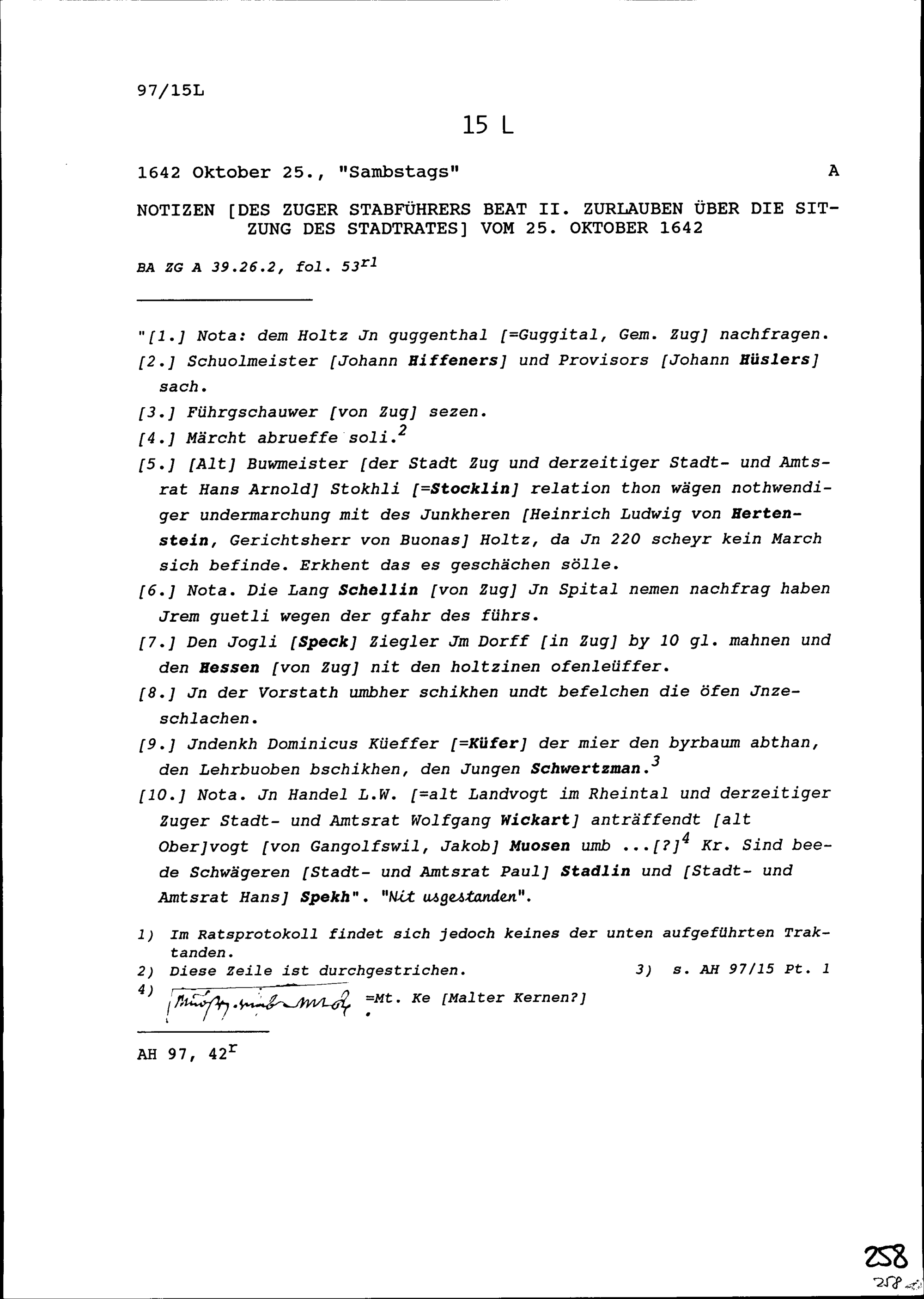 Notiz von Beat II. Zurlauben, Stabführer der Stadt Zug, über die Sitzung des Stadtrats vom 25. Oktober 1642