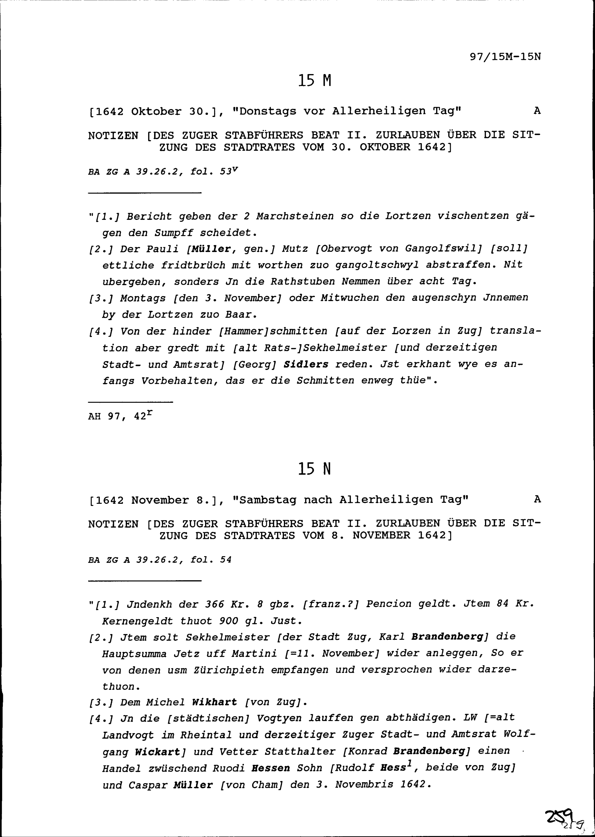 Notiz von Beat II. Zurlauben, Stabführer der Stadt Zug, über die Sitzung des Stadtrats vom 30. Oktober 1642