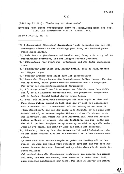 Notiz von Beat II. Zurlauben, Stabführer der Stadt Zug, über die Sitzung des Stadtrats vom 26. April 1642