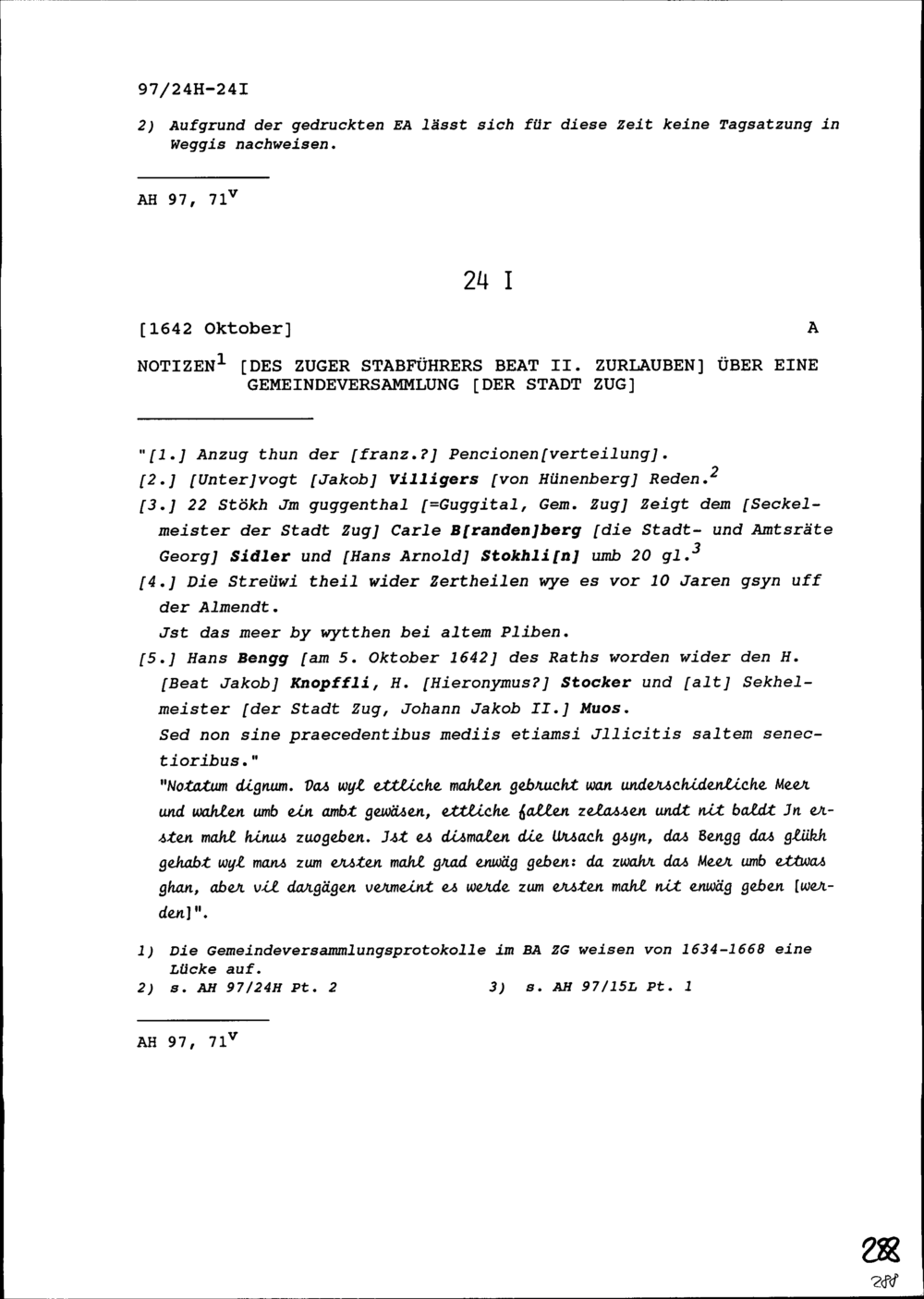 Notiz von Beat II. Zurlauben, Stabführer der Stadt Zug, über eine Gemeindeversammlung der Stadt Zug