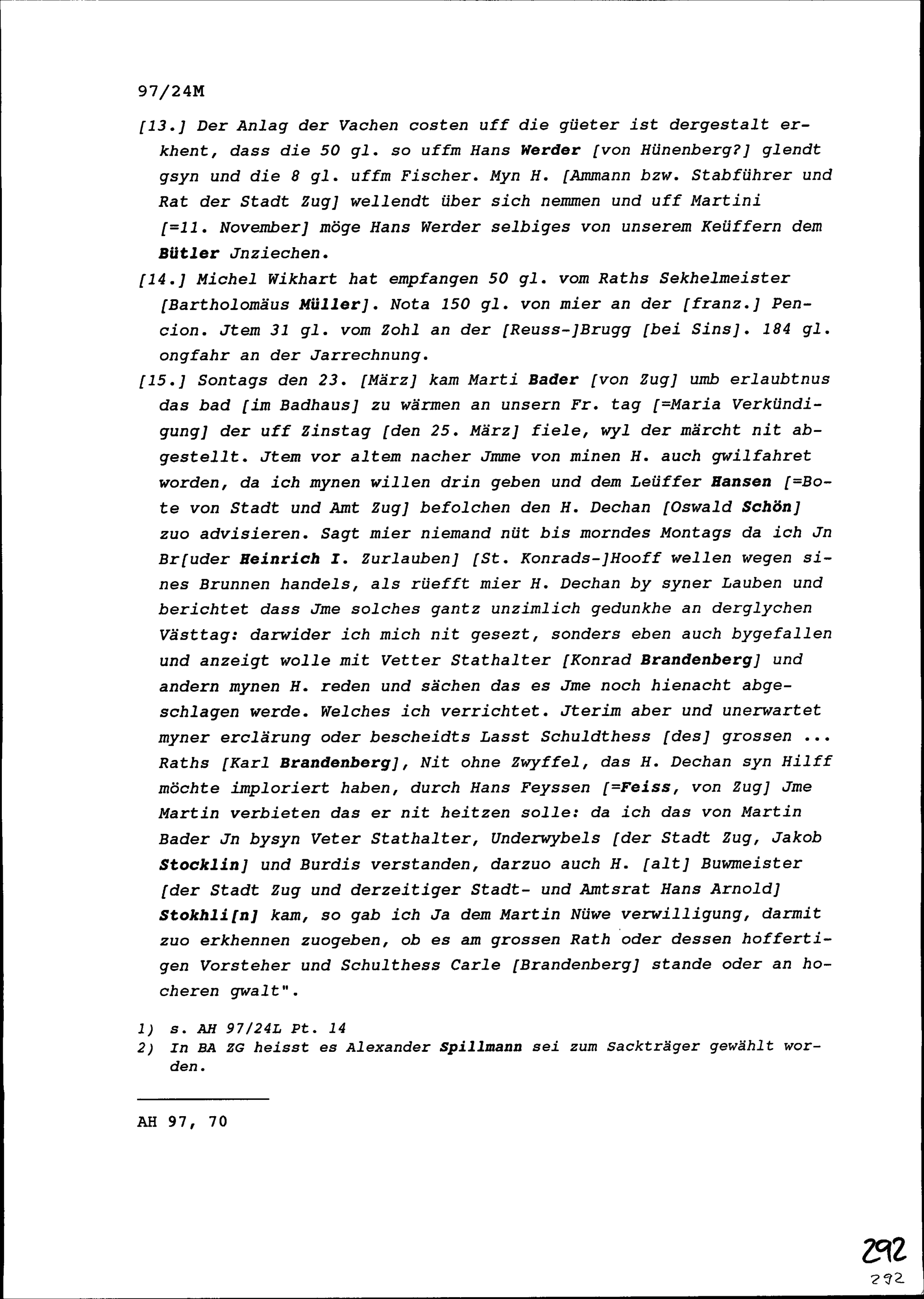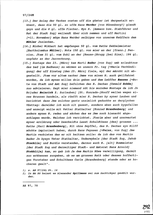 Notiz von Beat II. Zurlauben, Stabführer der Stadt Zug, über die Sitzung des Stadtrats vom 22. März 1642