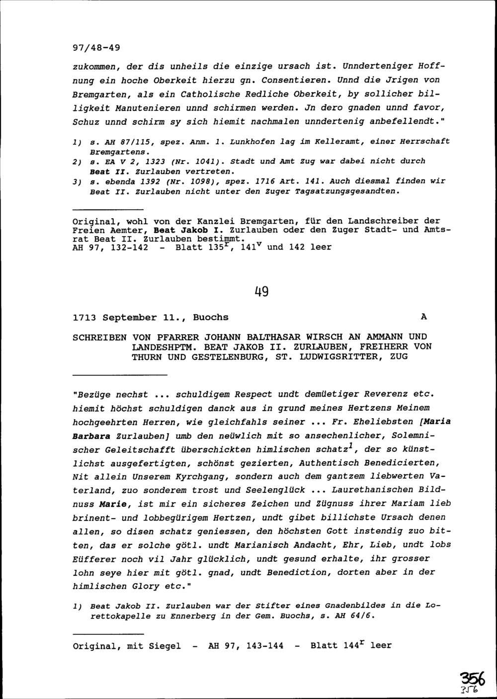 Schreiben von Johann Balthasar Wirsch, Pfarrer, an Beat Jakob II. Zurlauben, Ammann und Landeshauptmann, Zug