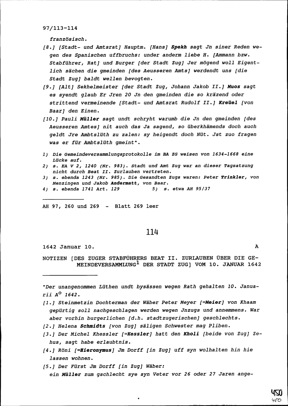 Notiz von Beat II. Zurlauben, Stabführer der Stadt Zug, über die Gemeindeversammlung der Stadt Zug vom 10. Januar 1642