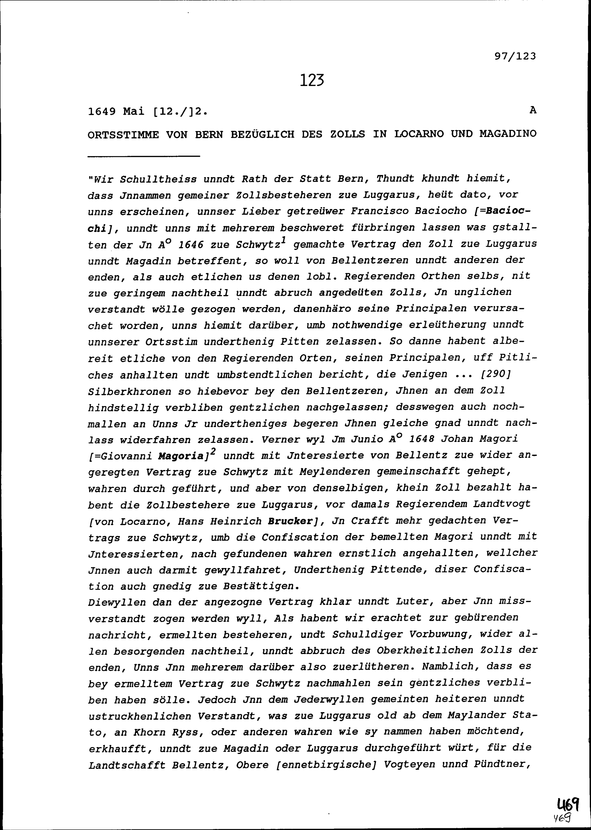 Ortsstimme von Bern bezüglich des Zolls in Locarno und Magadino