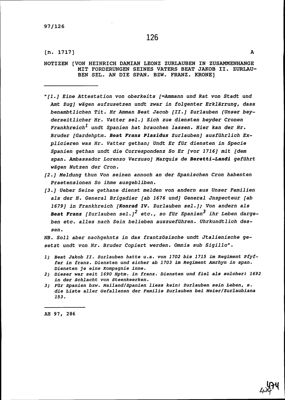 Notiz von Heinrich Damian Leonz Zurlauben in Zusammenhang mit Forderungen seines Vaters Beat Jakob II. Zurlauben, selig an die spanische beziehungsweise französische Krone