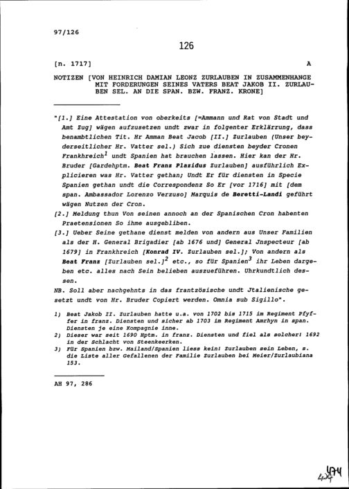 Notiz von Heinrich Damian Leonz Zurlauben in Zusammenhang mit Forderungen seines...
