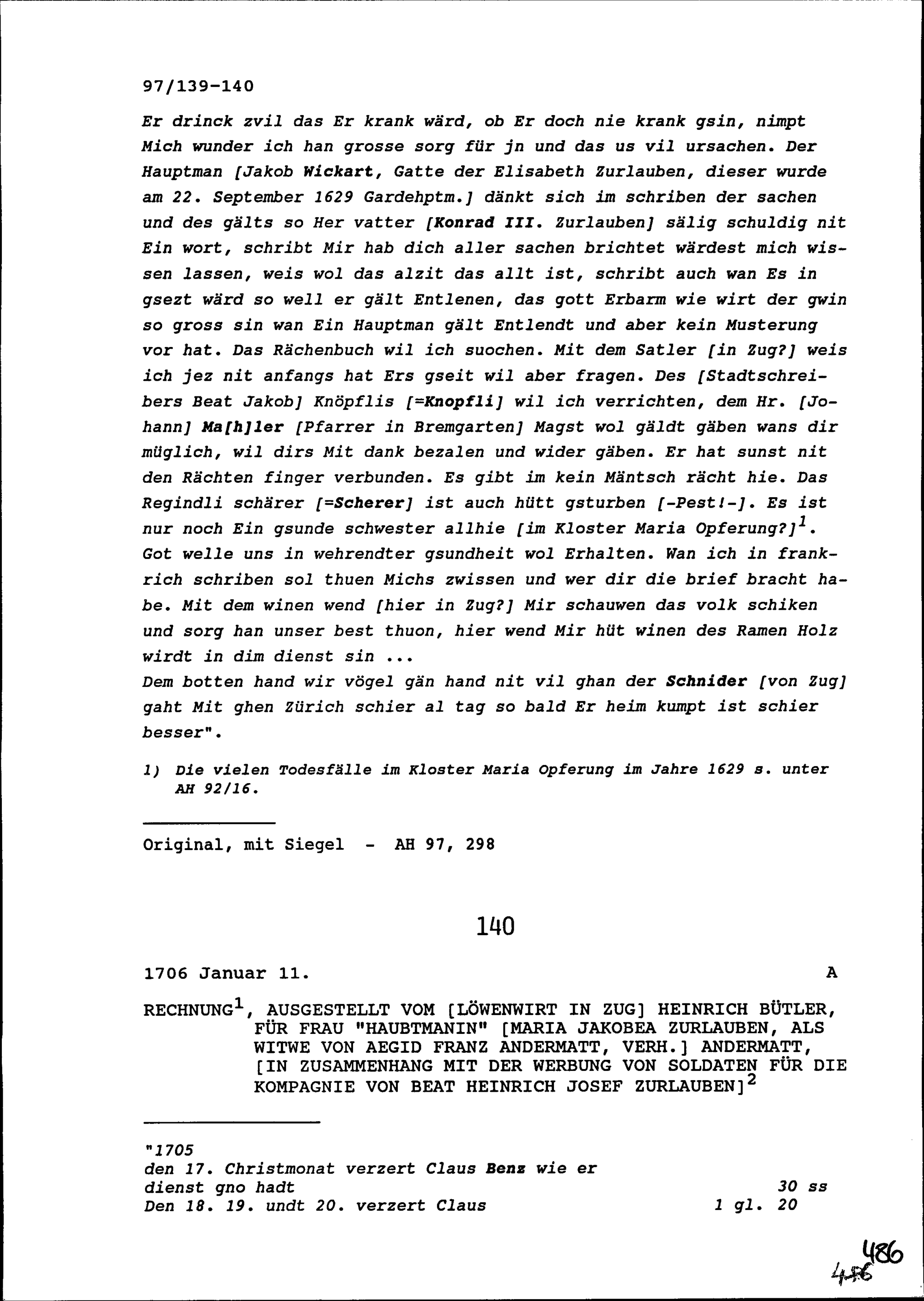 Rechnung für Maria Jakobea Zurlauben, Witwe von Ägid Franz Andermatt, Hauptmann, wegen Werbung von Soldaten für die Kompanie von Beat Heinrich Josef Zurlauben, ausgestellt von Heinrich Bütler, Löwenwirt in Zug