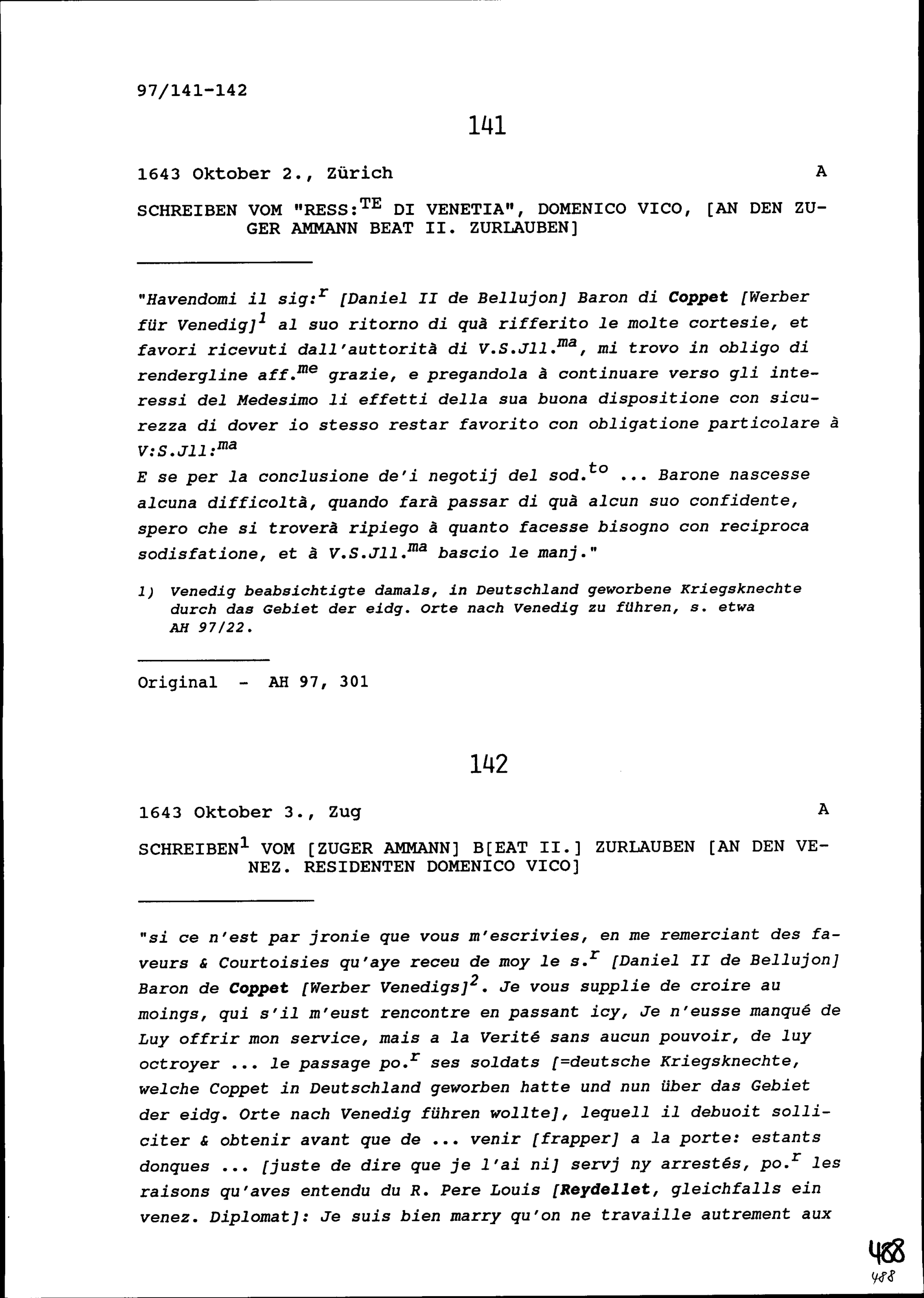 Schreiben von Domenico Vico, Resident von Venedig, an Beat II. Zurlauben, Ammann Zug