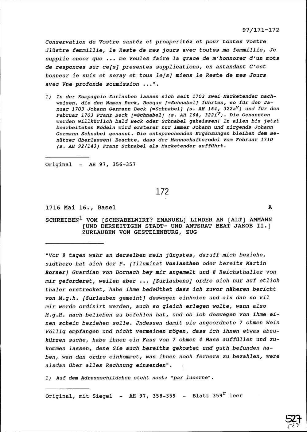 Schreiben von Emanuel Linder, Schnabelwirt, an Beat Jakob II. Zurlauben, Altammann...