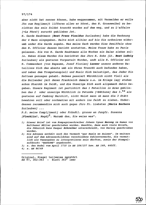 Schreiben von Balthasar Müller, Leutnant, Glarus, an Beat Jakob II. Zurlauben, Inhaber der Kompanie Zurlauben im Regiment Pfyffer, Stadt- und Amtrat und Landmajor, Zug