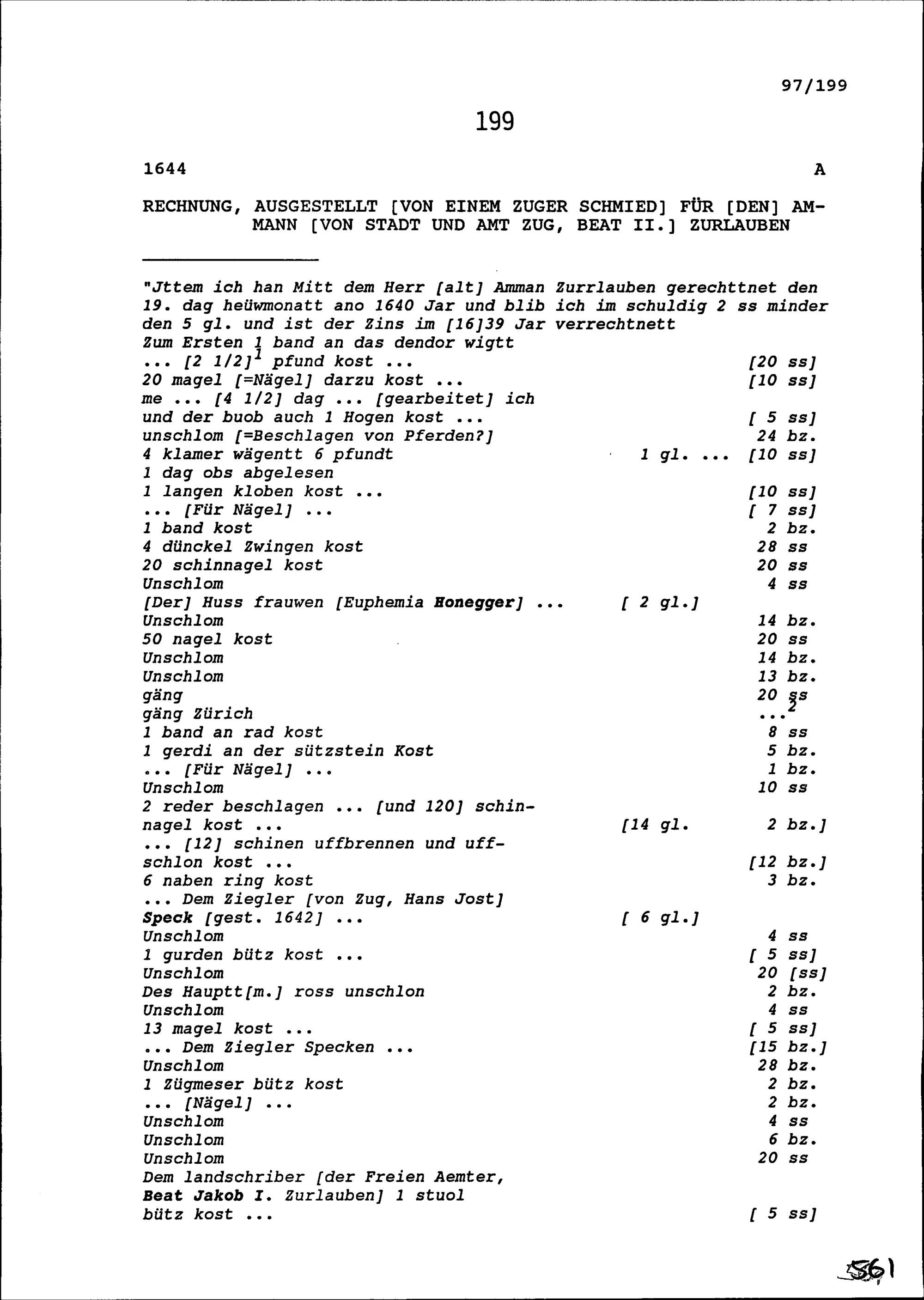 Rechnung für Beat II. Zurlauben, Ammann von Stadt und Amt Zug, ausgestellt von einem Zuger Schmied