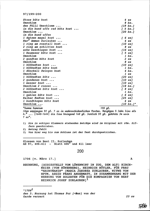 Rechnung für Maria Jakobea Zurlauben, Witwe von Ägid Franz Andermatt, Hauptmann, in Zusammenhang mit der Werbung von Soldaten für die Kompanien von Beat Heinrich Josef Zurlauben, ausgestellt von Heinrich Bütler, Löwenwirt in Zug und Altkirchmeier von Hünenberg
