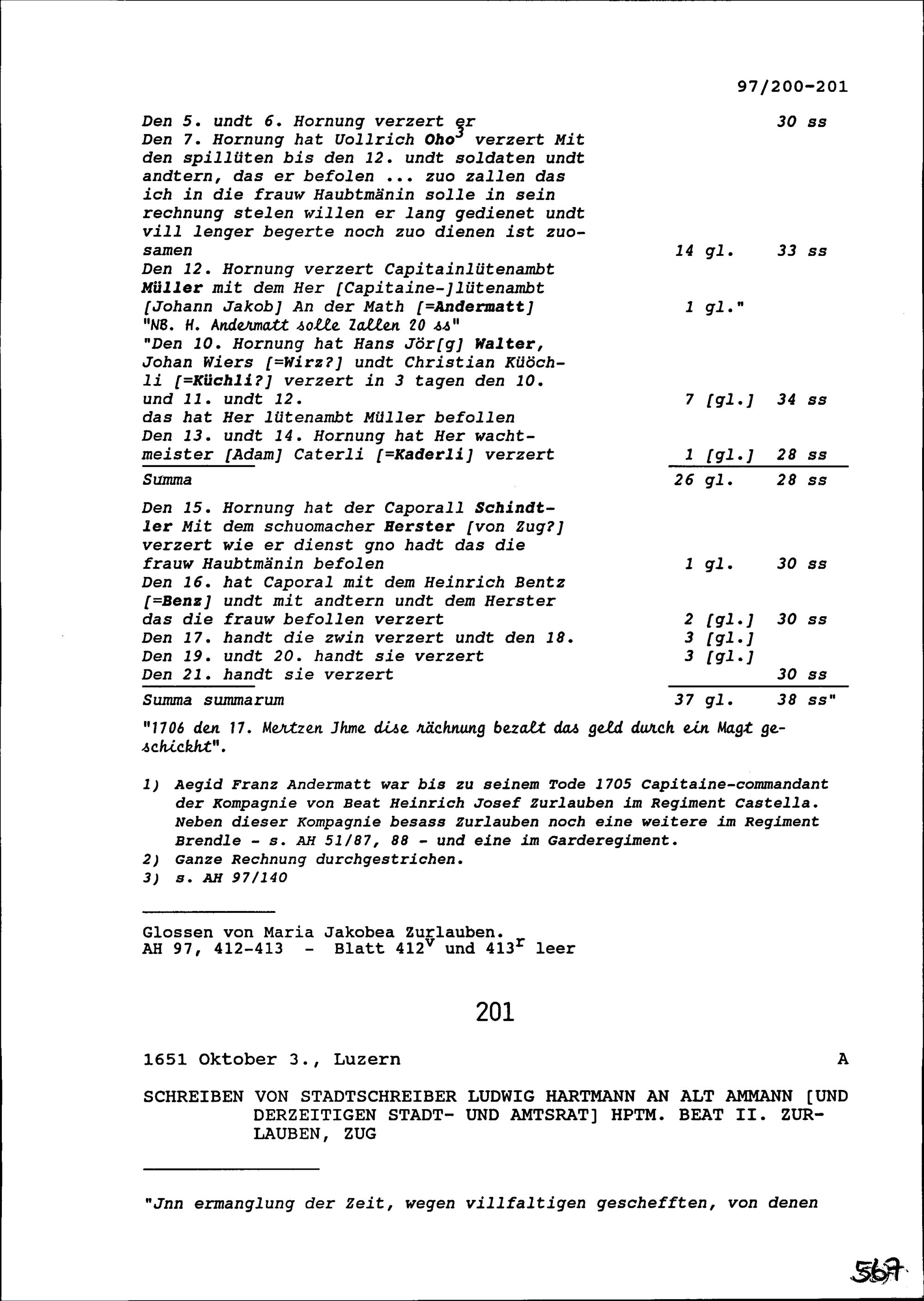 Schreiben von Ludwig Hartmann, Stadtschreiber, an Beat II. Zurlauben, Hauptmann und...
