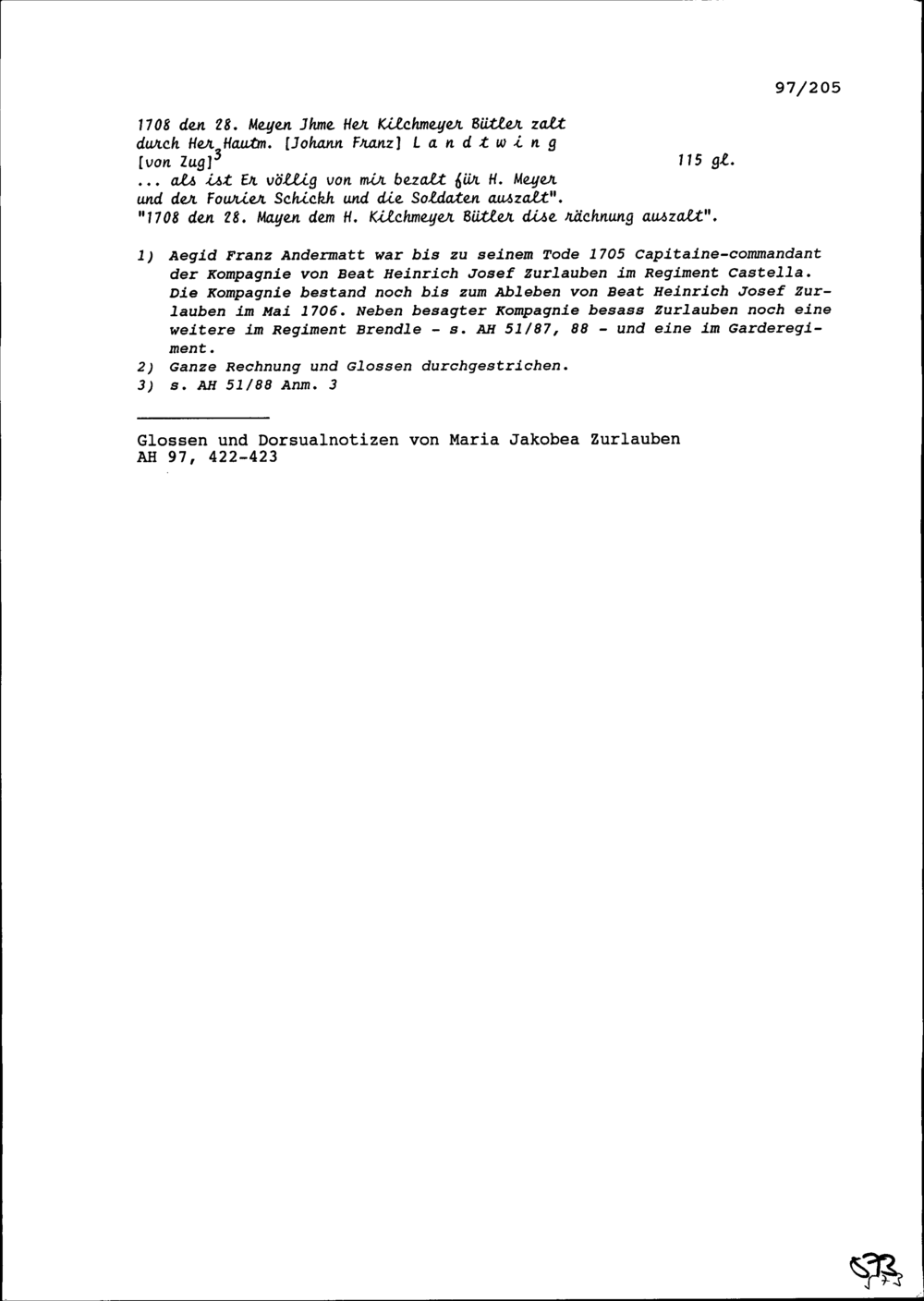 Rechnung für Maria Jakobea Zurlauben, Witwe von Ägid Franz Andermatt, Hauptmann, in Zusammenhang mit der Werbung von Soldaten für die Kompanien von Beat Heinrich Josef Zurlauben, ausgestellt von Heinrich Bütler, Löwenwirt in Zug und Altkirchmeier von Hünenberg