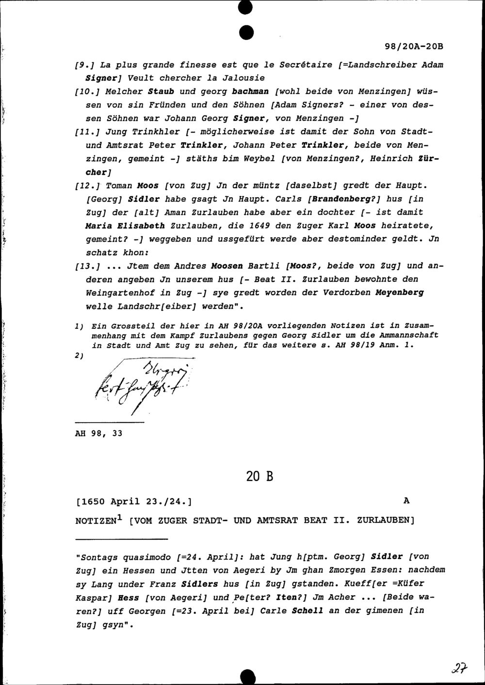 Notiz von Beat II. Zurlauben, Stadt- und Amtrat Zug