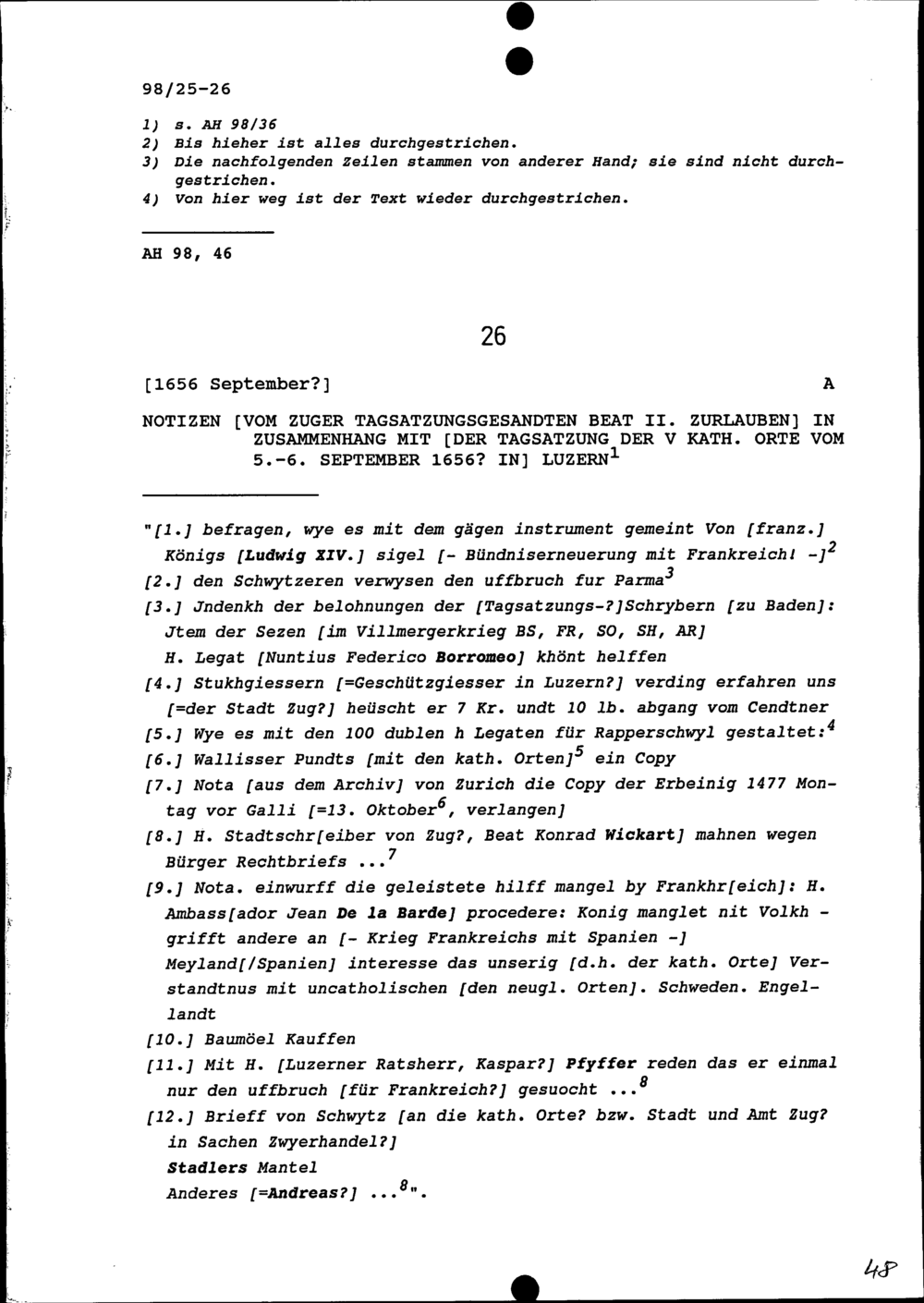 Notiz von Beat II. Zurlauben, Zuger Tagsatzungsgesandter, in Zusammenhang mit der Tagsatzung der Fünf Katholischen Orte vom 5. bis 6. September 1656 in Luzern