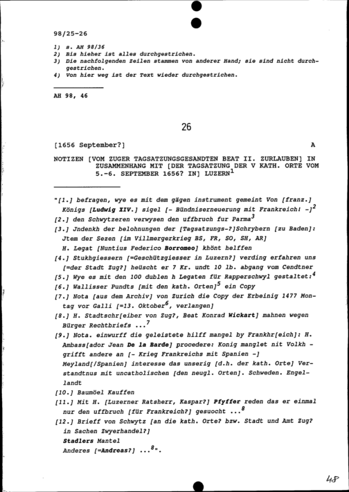 Notiz von Beat II. Zurlauben, Zuger Tagsatzungsgesandter, in Zusammenhang mit der...