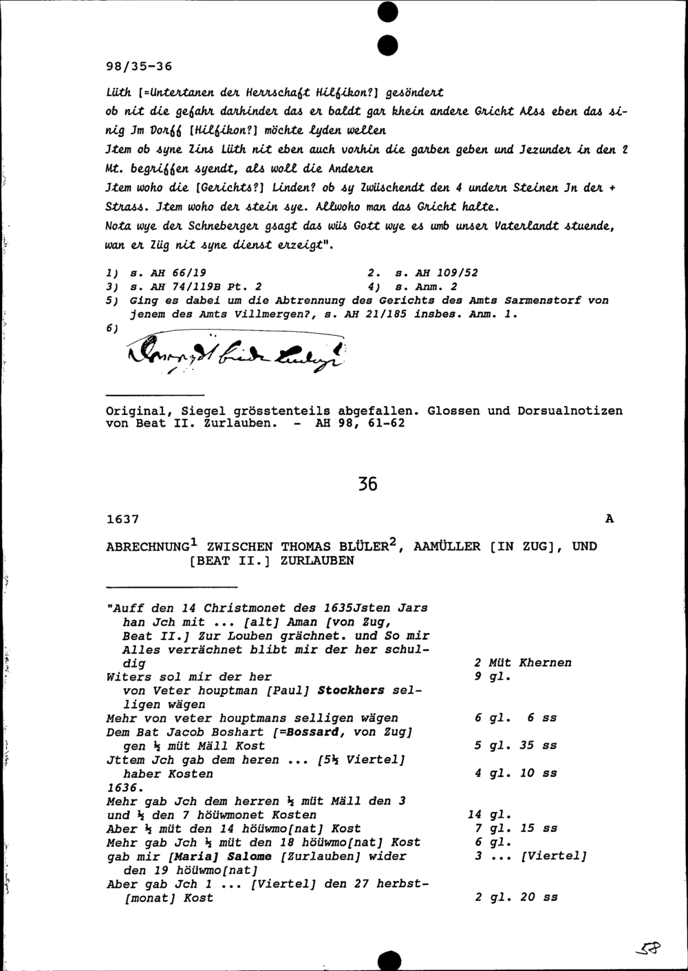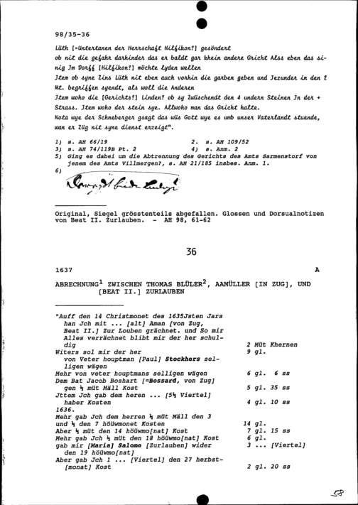 Abrechnung zwischen Thomas Blüler, Aamüller in Zug, und Beat II. Zurlauben
