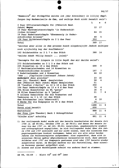 Ausgaben für Ausrüstung, bei Felix Utiger, Leutnant von der Kompanie von Beat Jakob II. Zurlauben, Hauptmann im Regiment Pfyffer seit der Schlacht von Ramillies vom 23. Mai 1706 und von Juni 1706 zu Ypern bis Mai 1707 zu Lille