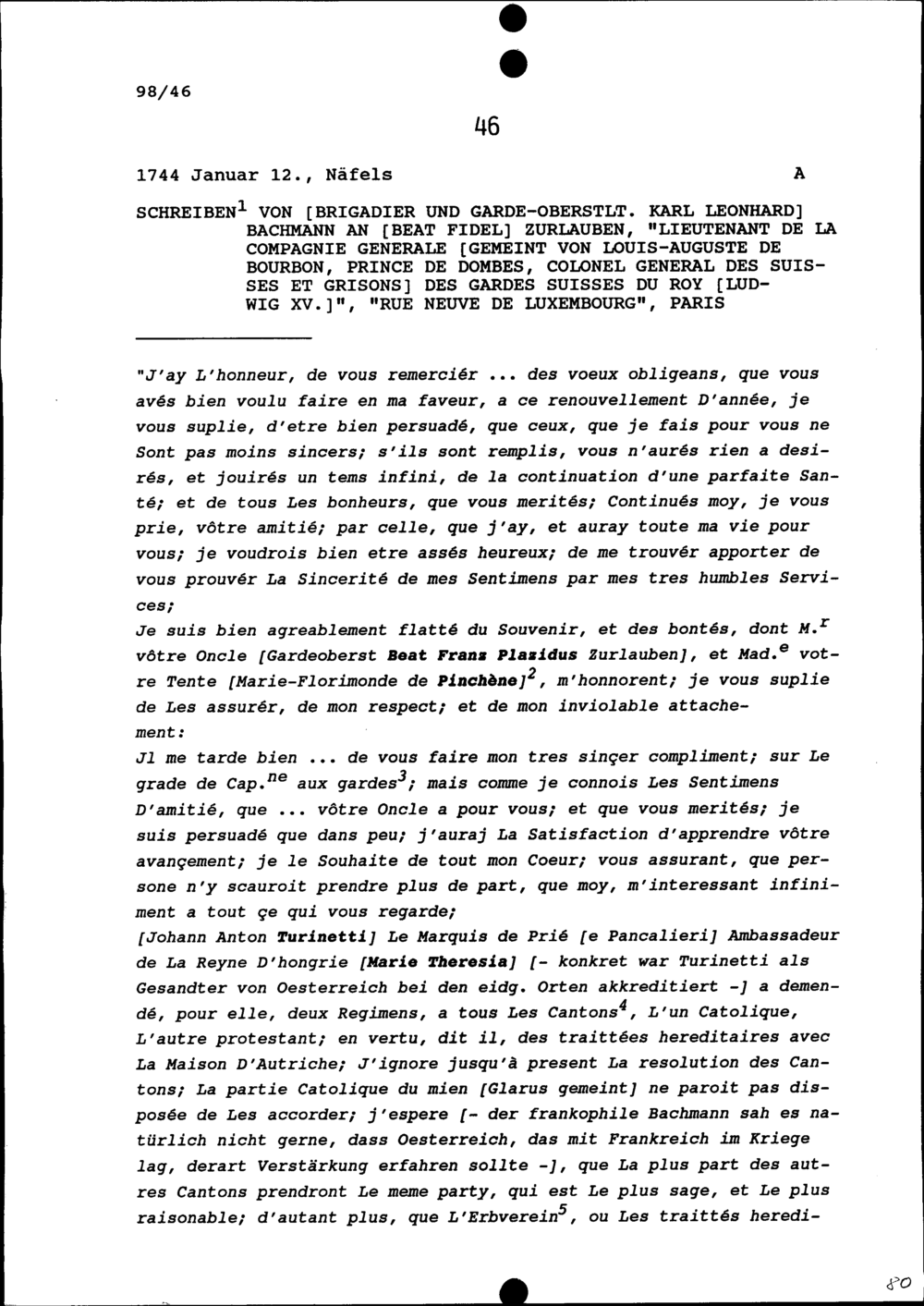 Schreiben von Karl Leonhard Bachmann, Brigadier und Gardeoberstleutnant, an Beat Fidel Zurlauben, Leutnant, Paris