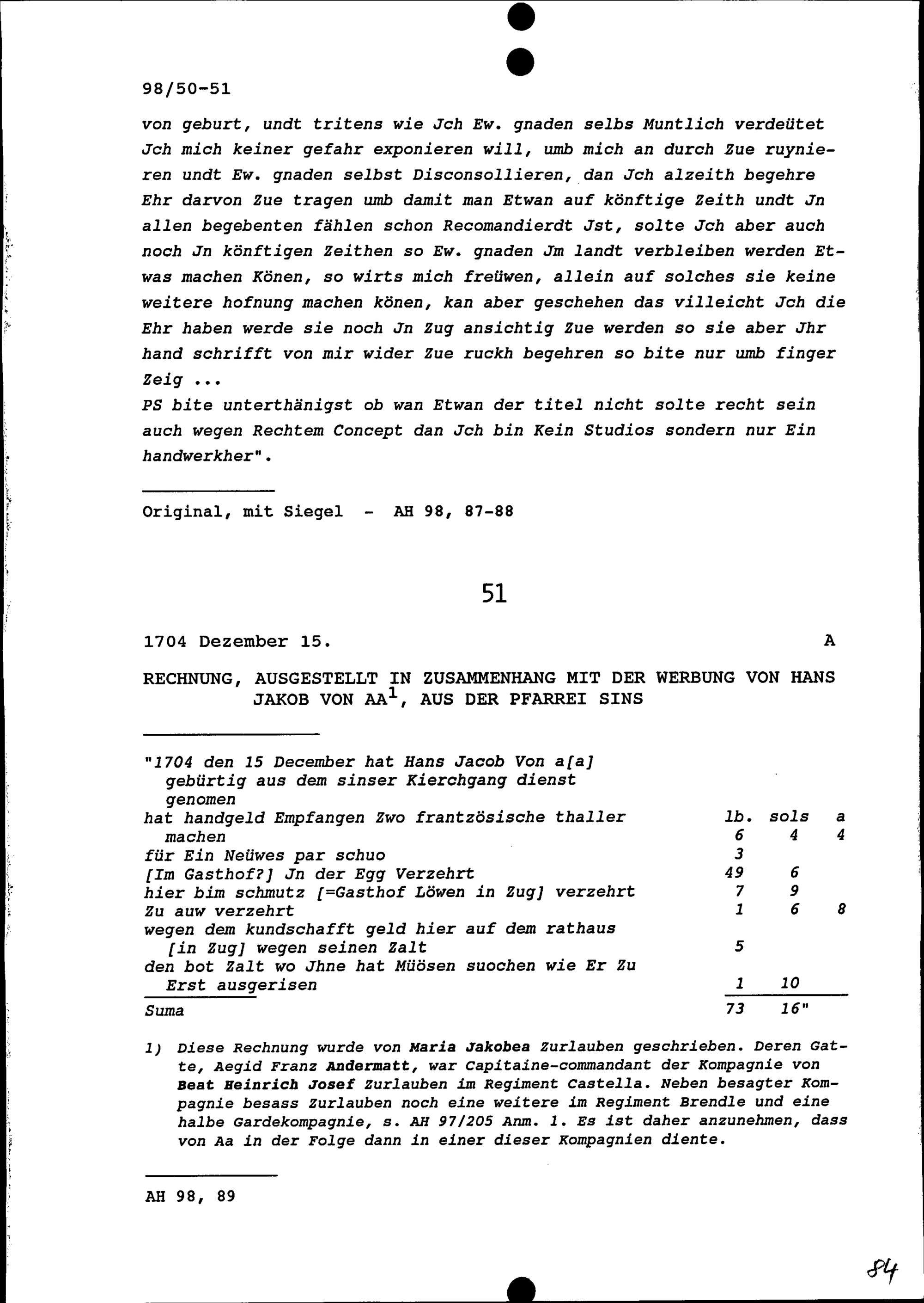 Rechnung in Zusammenhang mit der Werbung, ausgestellt von Hans Jakob von Aa aus der Pfarrei Sins