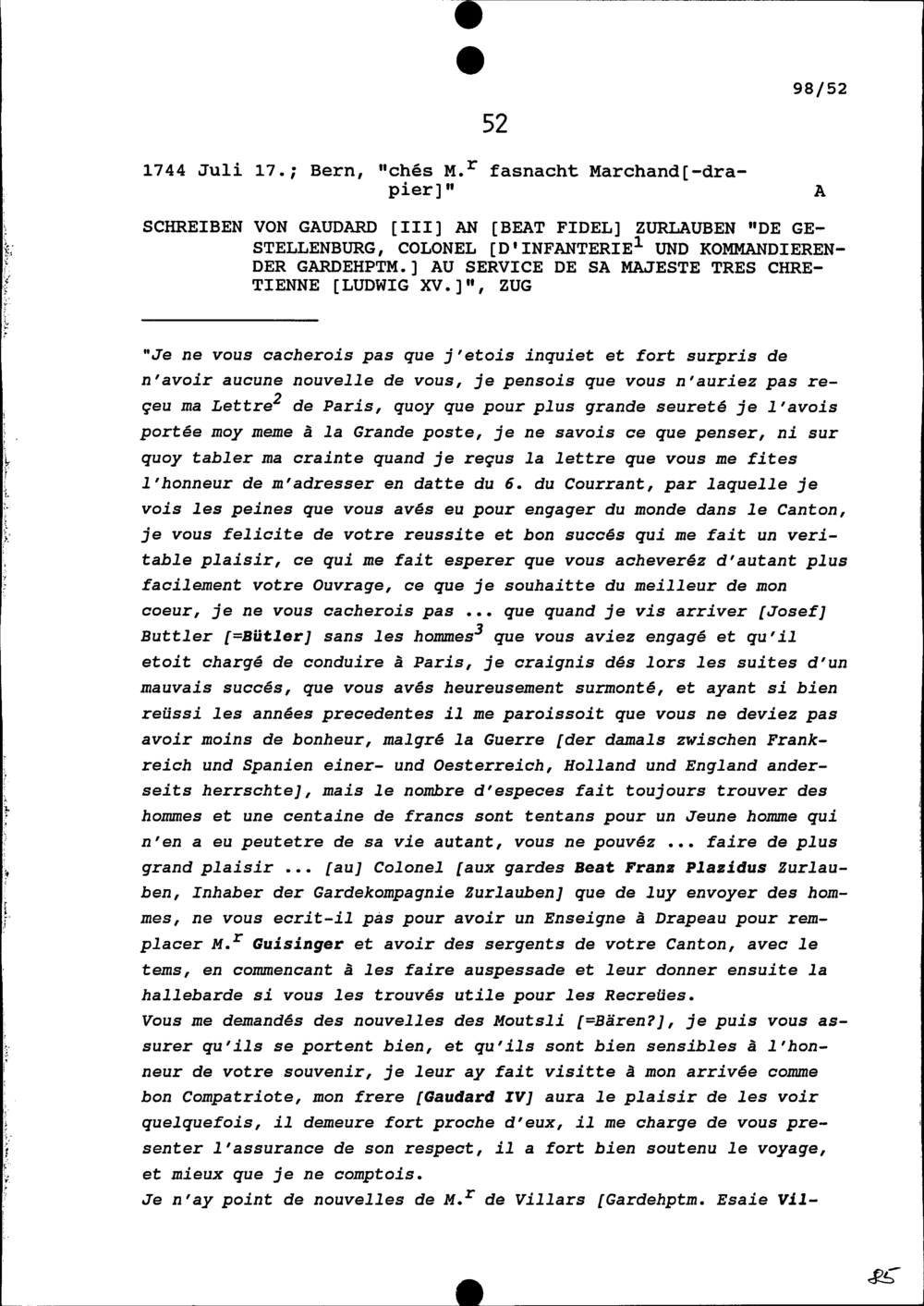 Schreiben von Louis Gaudard an Beat Fidel Zurlauben, Gardehauptmann, Zug