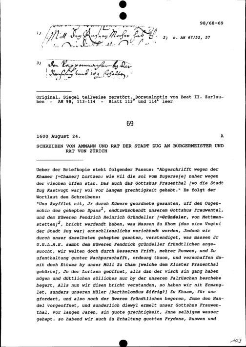 Schreiben des Ammanns und Rats der Stadt Zug an Bürgermeister und Rat Zürich
