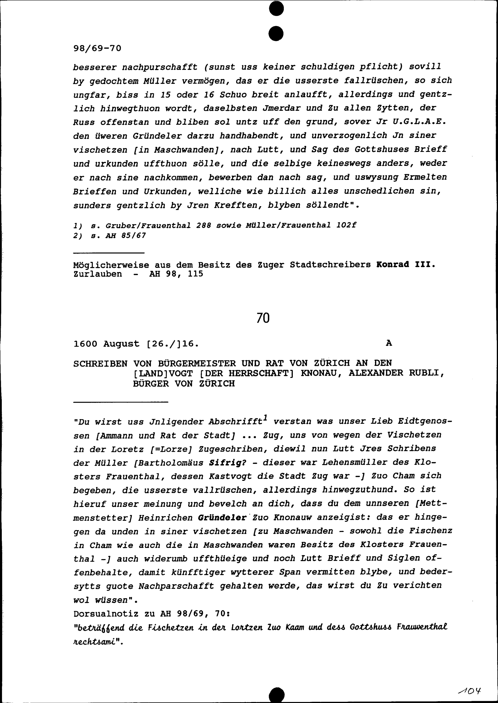 Schreiben des Bürgermeisters und Rats Zürich an Alexander Rubli, Landvogt der Herrschaft Knonau, Bürger von Zürich