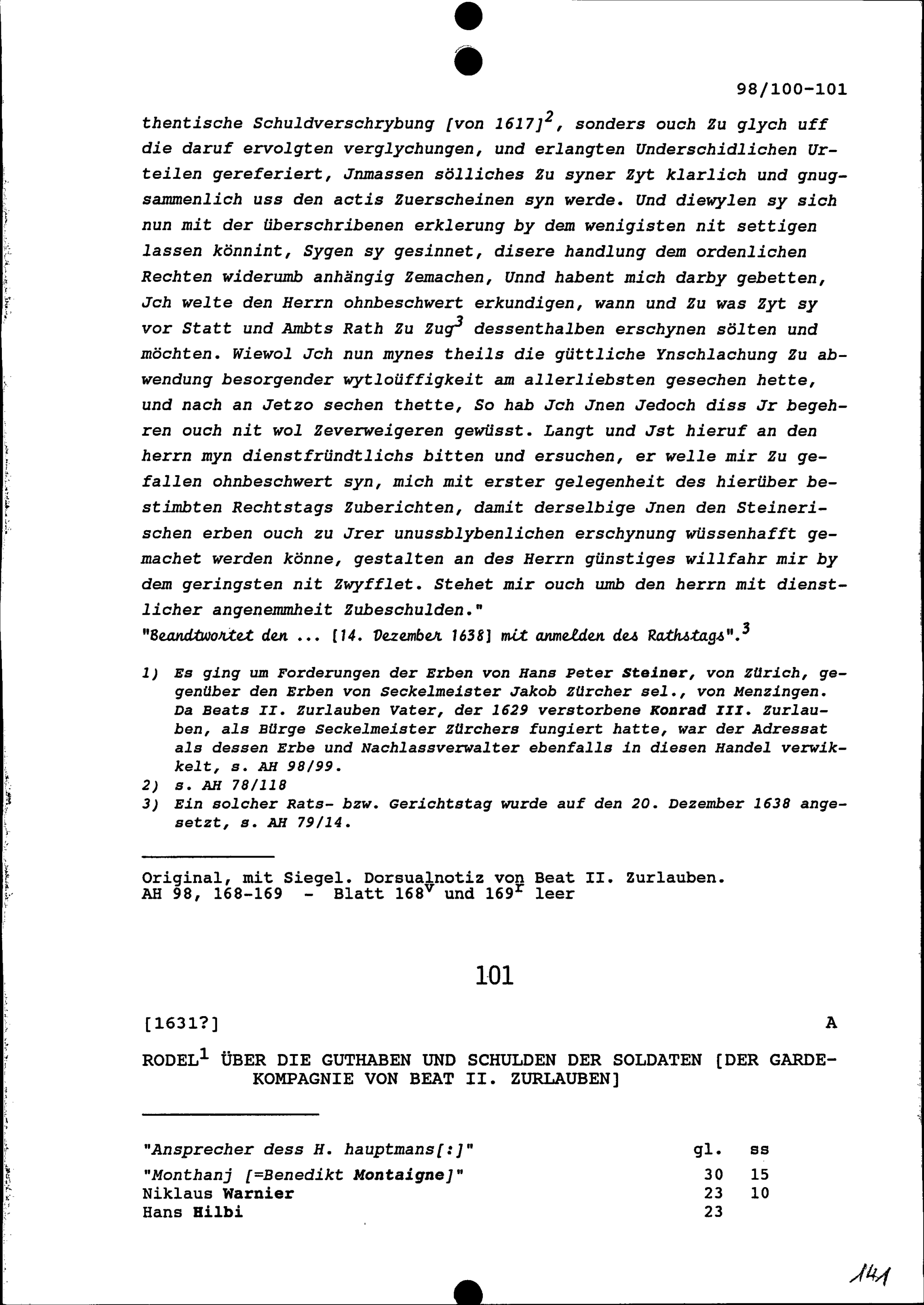 Rodel über die Guthaben und Schulden der Soldaten der Gardekompanie von Beat II. Zurlauben
