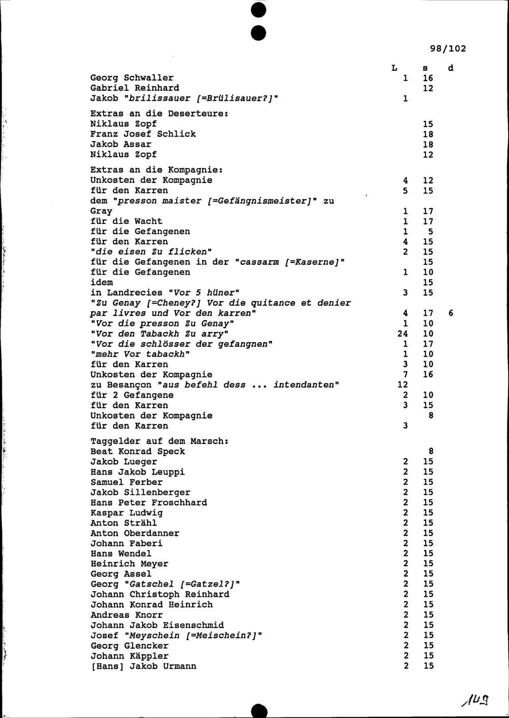Ausgaben für die Kompanie von Beat Jakob II. Zurlauben, Hauptmann im Regiment Pfyffer, von Hüningen bis Vallenciennes